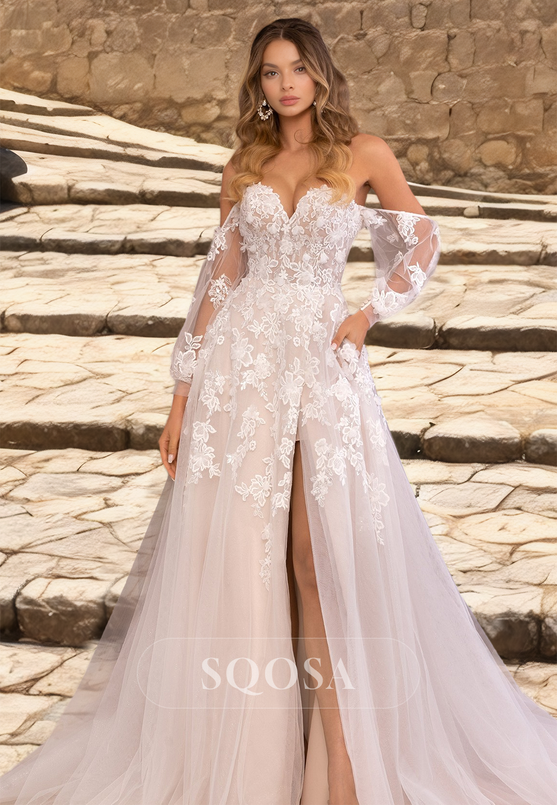 Revamp your wedding look with our Off-Shoulder Sweetheart Half-Sleeves Lace Applique Train Tulle A-Line Dress. The elegant lace applique and high slit add the right amount of sophistication and allure to this dress. Perfect for a romantic A-line silhouette, this dress will make you feel and look stunning on your special day.