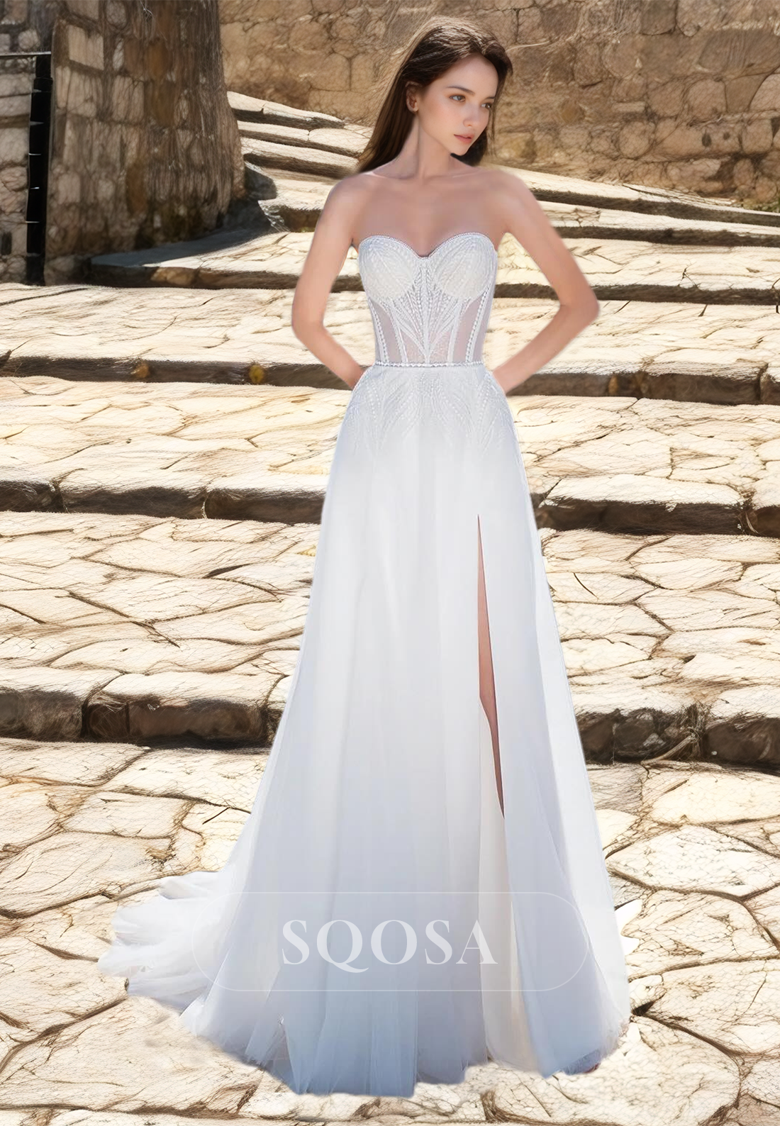 Expertly crafted with delicate lace applique, this A-line wedding dress features a high-neck and sweetheart neckline, adding a touch of elegance to your special day. The long sleeves provide coverage while the high slit adds a touch of sensuality. A perfect combination of sophistication and style.