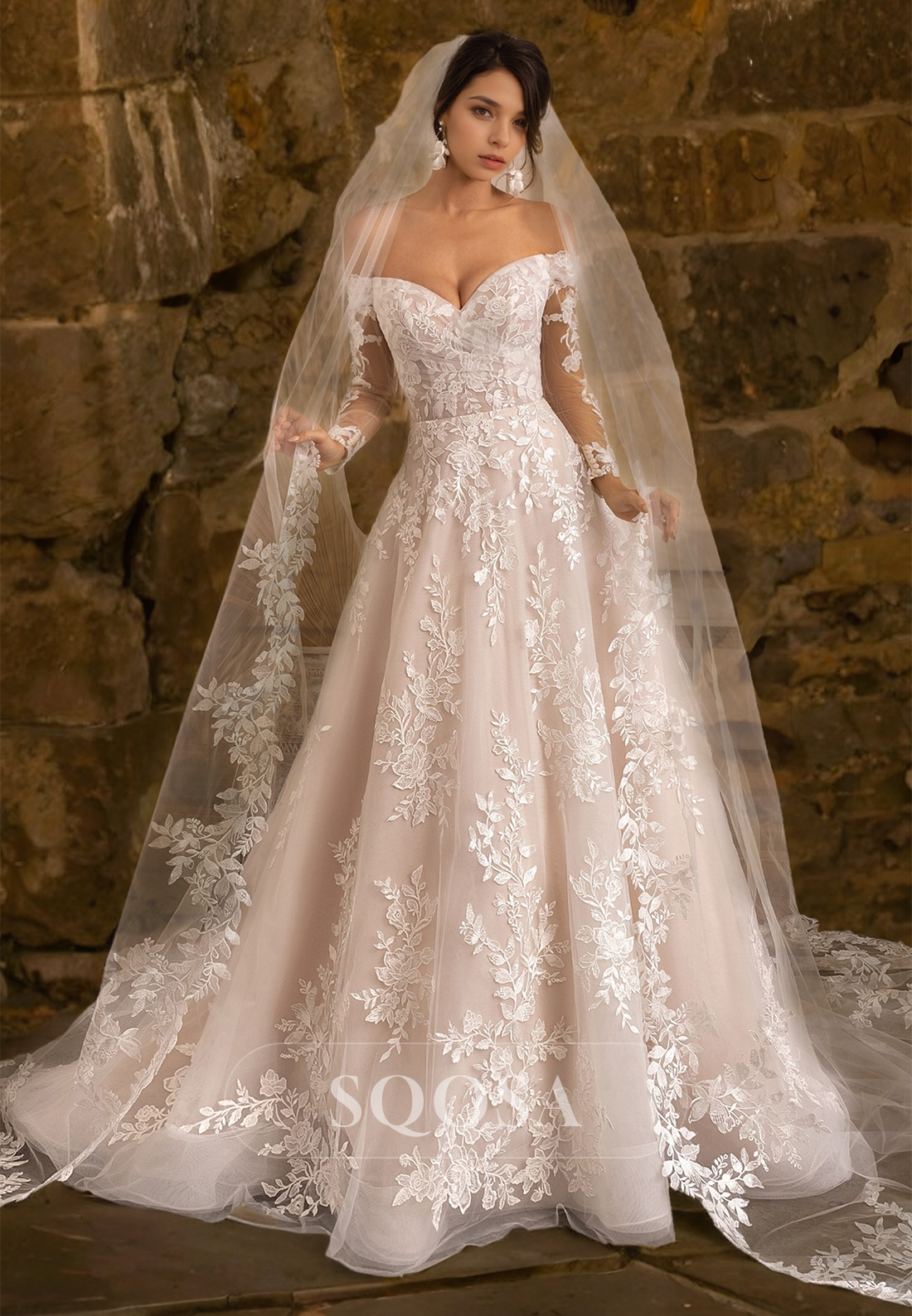 This elegant Sweetheart Long-Sleeves A-Line Wedding Dress features an off-shoulder neckline and delicate lace applique overlay, perfect for a romantic bride. The A-line silhouette flatters all body types, while long sleeves add a touch of sophistication. Feel like a goddess on your special day with this beautiful gown.