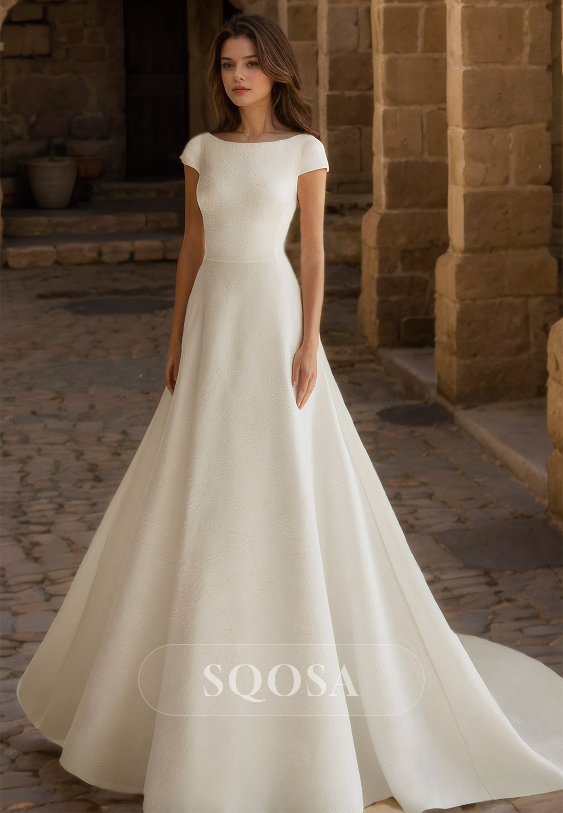 Scoop-Neck Short-Sleeves Satin A-Line Wedding Dress Allover Lace Applique Bride Gowns with Train x 1;