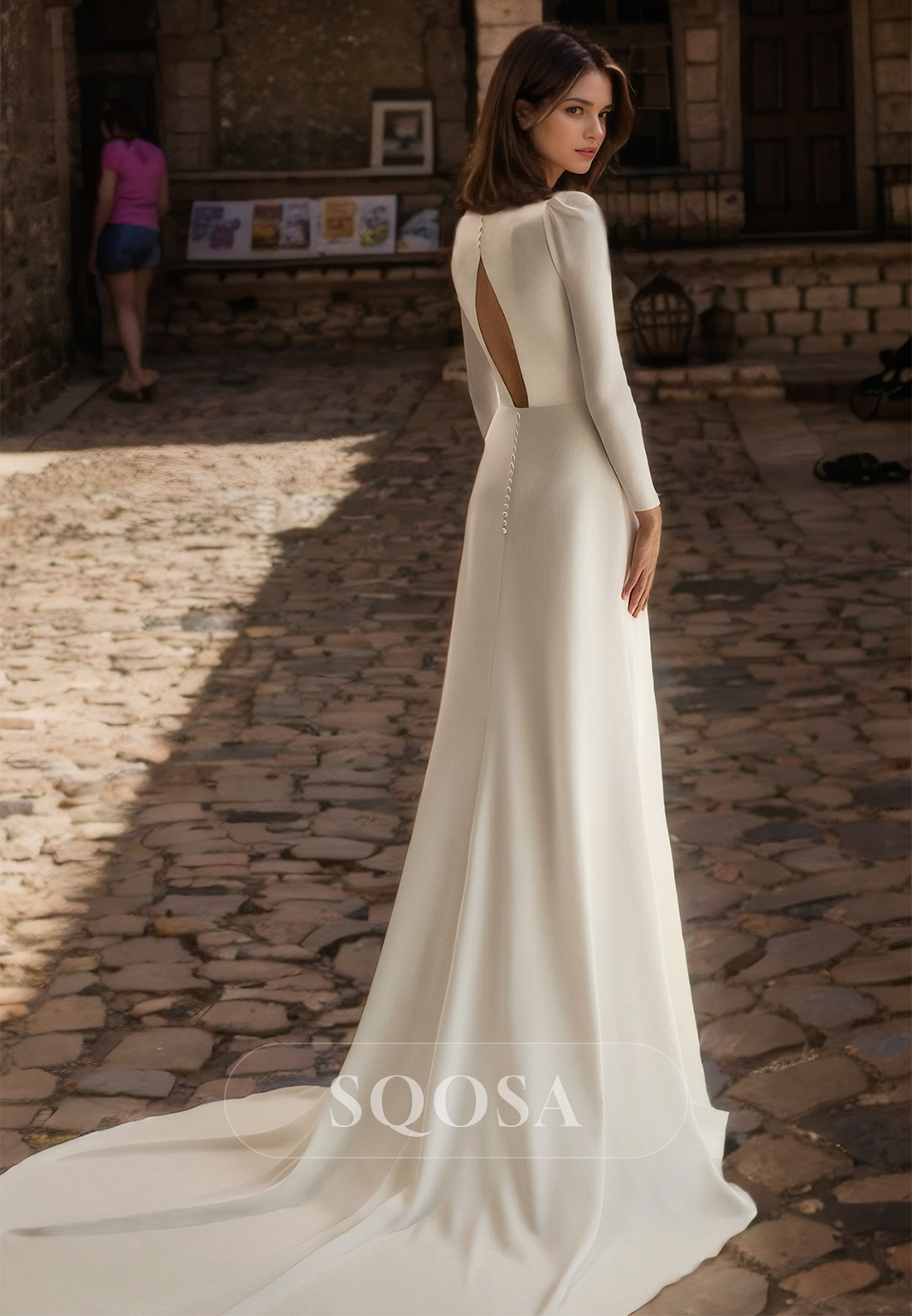 This elegant Pleated Sweetheart Long-Sleeves Satin Bride Gowns is crafted with a sweeping train and cutout design, perfect for a sophisticated and modern bride. The mermaid silhouette and sweetheart neckline flatter the figure, while the satin fabric provides a luxurious touch. Look stunning on your special day with this classic yet stylish wedding dress.