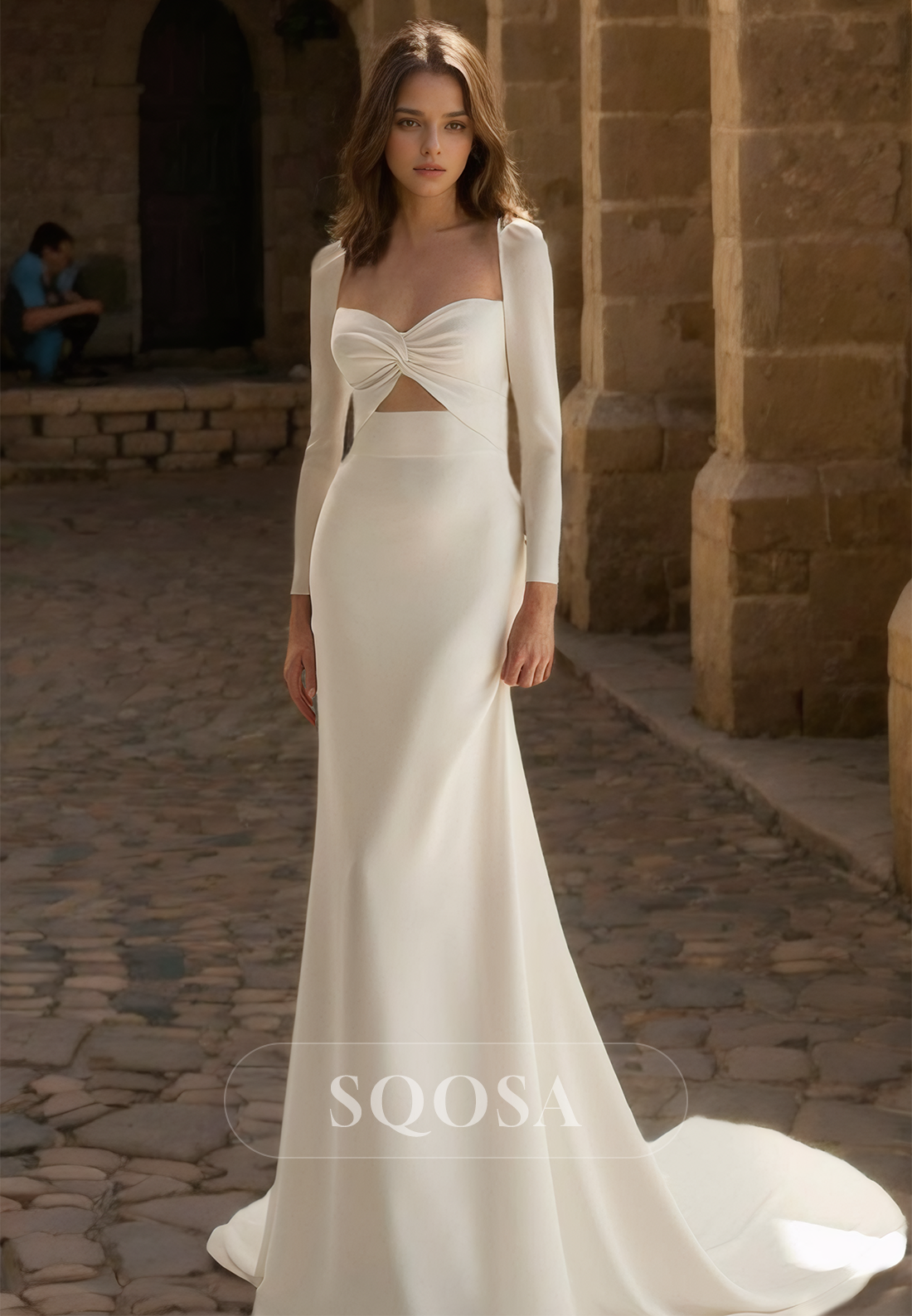 Pleated Sweetheart Long-Sleeves Satin Bride Gowns Sweep Train Cutout Satin Mermaid Wedding Dress