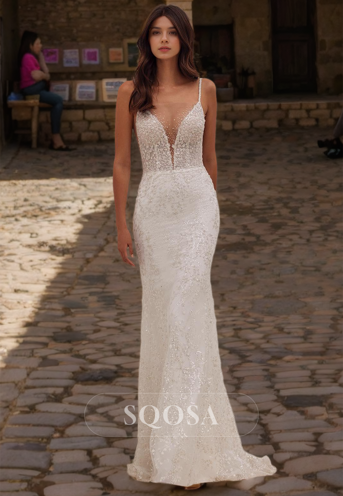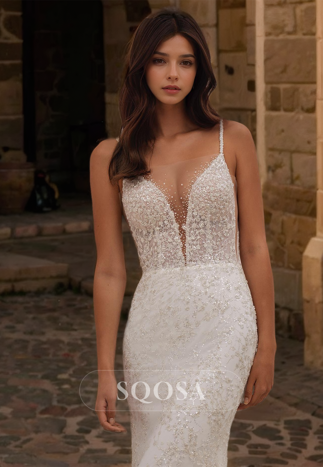 Allover Lace Applique Floor-Length Mermaid Wedding Dress Deep V-Neck Spaghetti Straps Bride Gowns