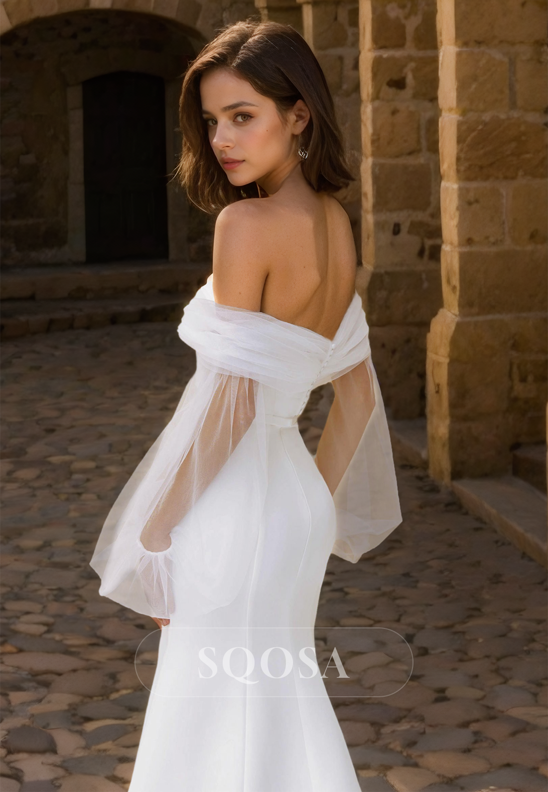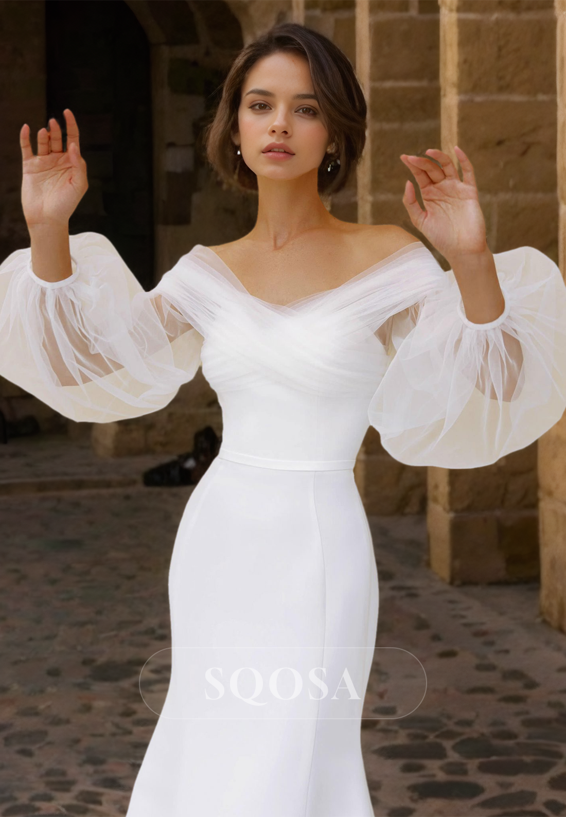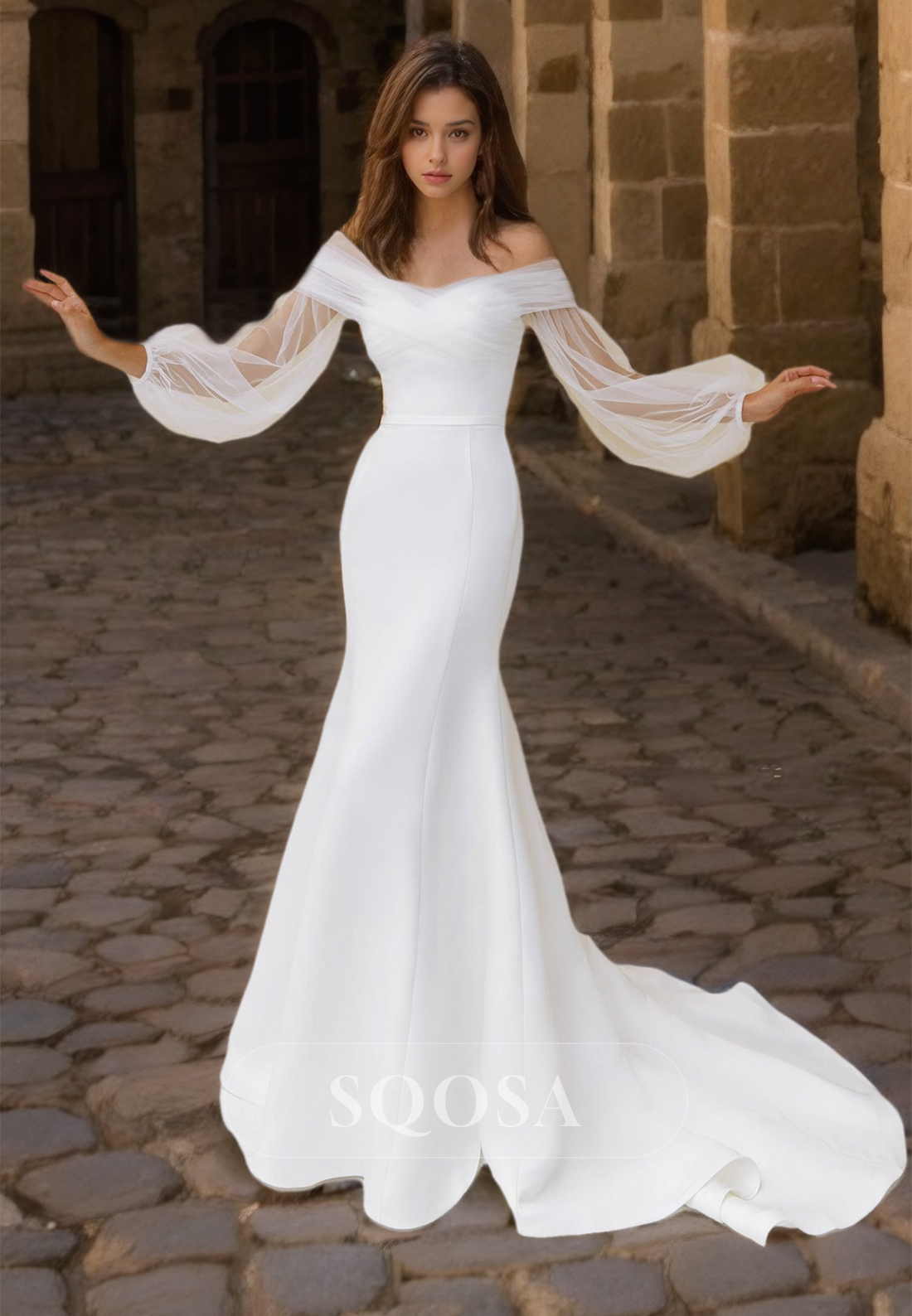 Sweetheart Off-Shoulder Satin Mermaid Wedding Dress Pleated Tulle Long-Sleeves Train Bride Gowns