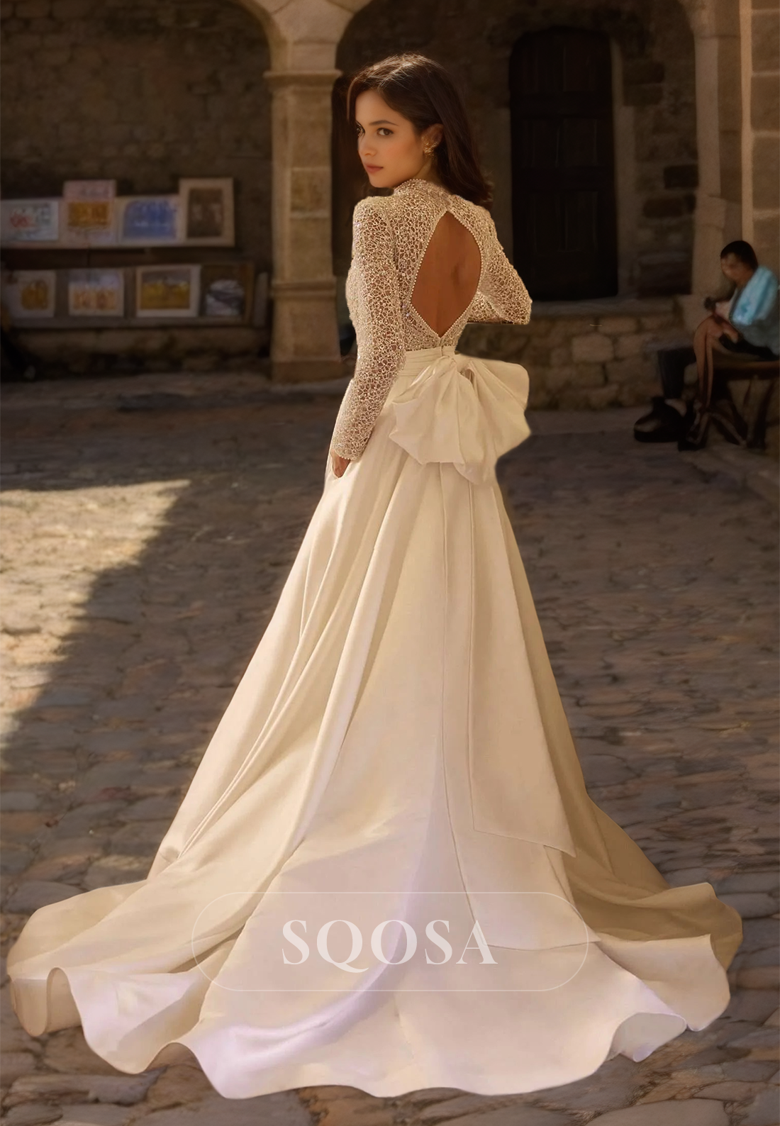 A-Line High-Neck Long-Sleeves Pleated Beaded Satin Wedding Dress with Lace Upper Body