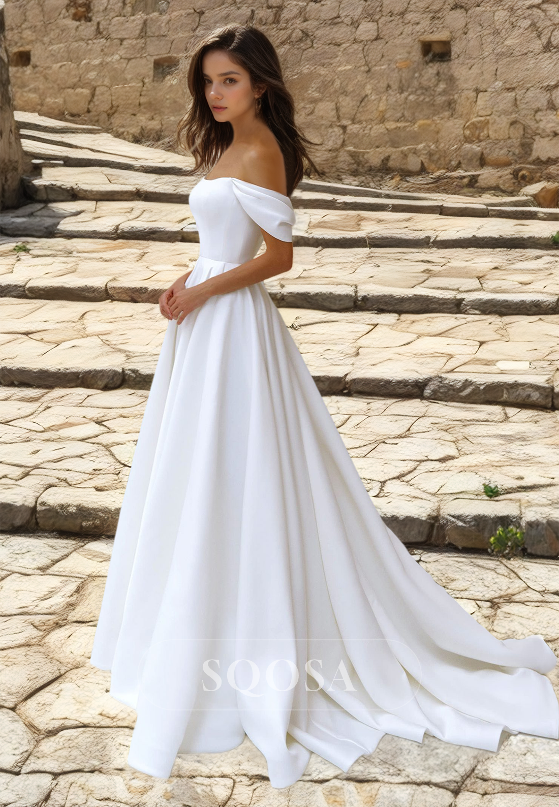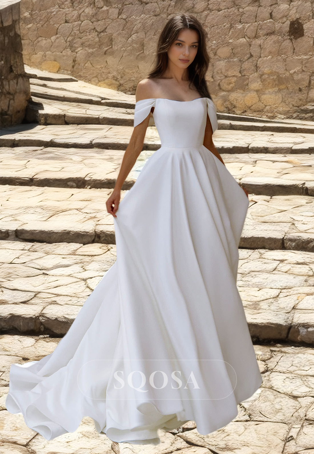 Simple Sweetheart Off-Shoulder Satin Bride Gowns Sleeveless Pleated A-Line Wedding Dress