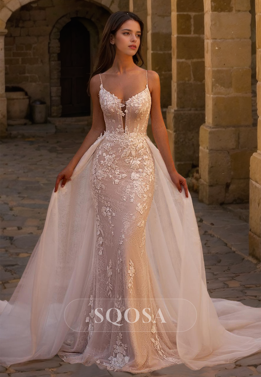 Plunging V-Neck Spaghetti Straps Mermaid Wedding Dress Allover Lace Applique Bride Gowns with Tulle Overskirt