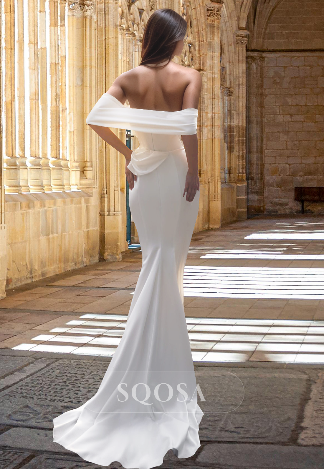 This elegant tube top off-shoulder wedding gown is perfect for the modern boho bride. The intricate beading and pleated details add a touch of glamour, while the mermaid silhouette and sweep train provide a romantic feel. Walk down the aisle in style with this beachy dress.