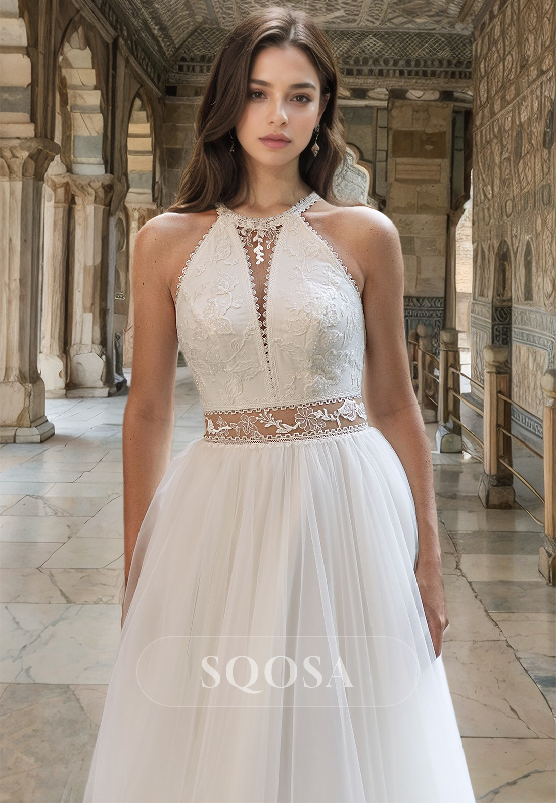 This elegant wedding dress features a halter scoop-neck design, off-shoulder sleeves, and a flattering A-line silhouette. The intricate lace applique and pleated tulle add a touch of romance to the bride's overall look. Walk down the aisle with confidence and charm in this stunning dress.