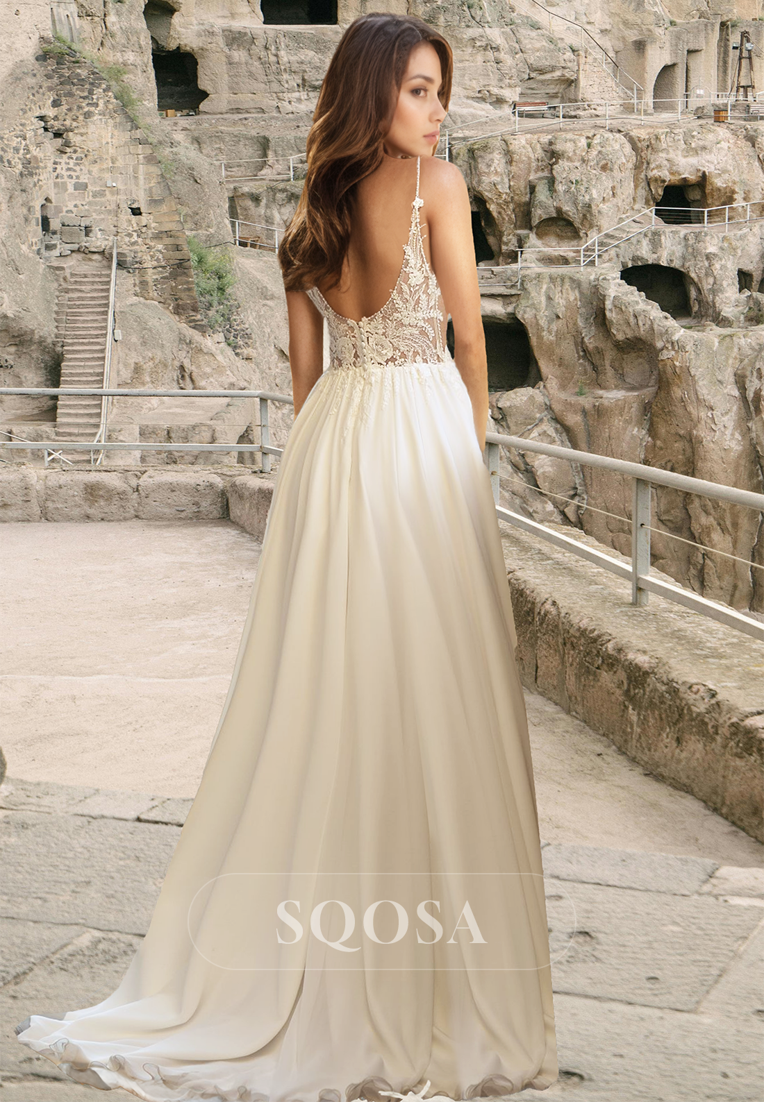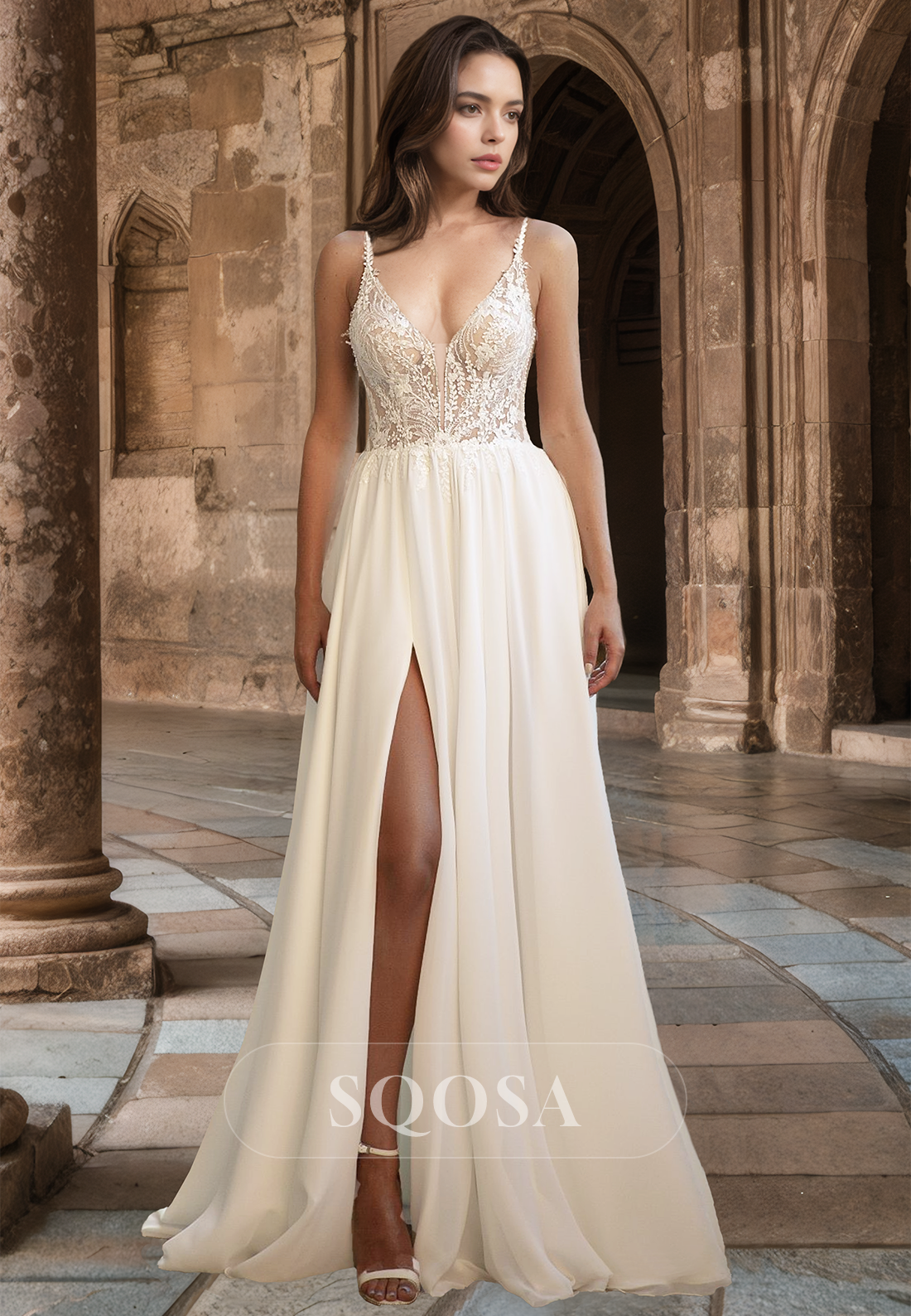 Spaghetti Straps Deep V-Neck Sleeveless Lace Applique Pleated Chiffon A-Line Wedding Dress with Slit