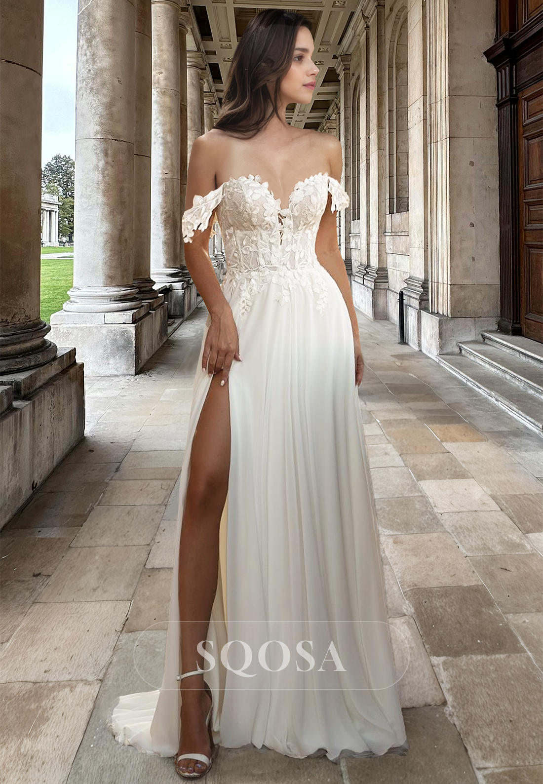 Sweetheart Sleeveless Chiffon A-Line Wedding Dress Foliage Motif Applique Bride Gowns with High Slit x 1;