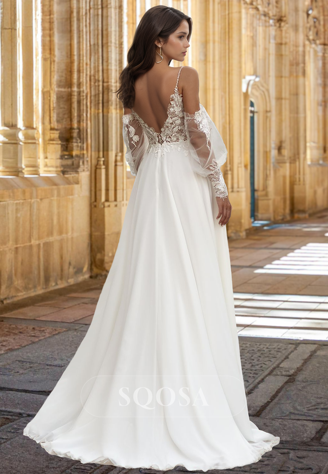 Spaghetti Straps V-Neck Off-Shoulder Bride Gowns Tulle Long-Sleeves Applique A-Line Wedding Dress