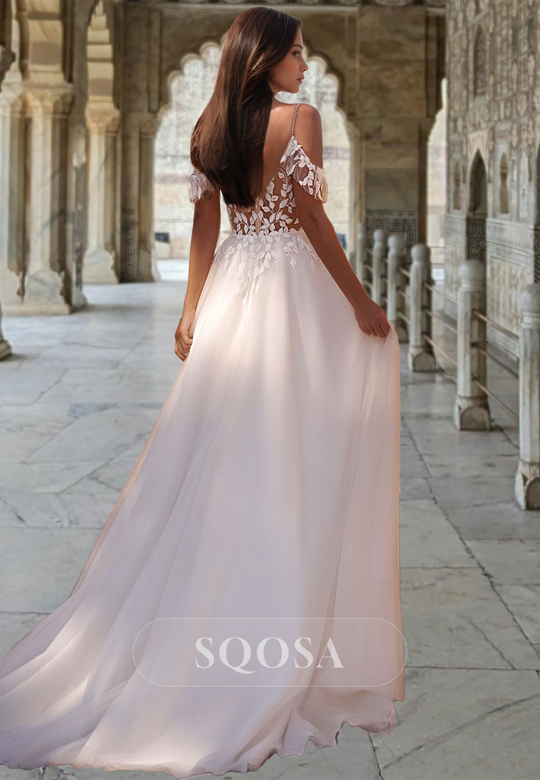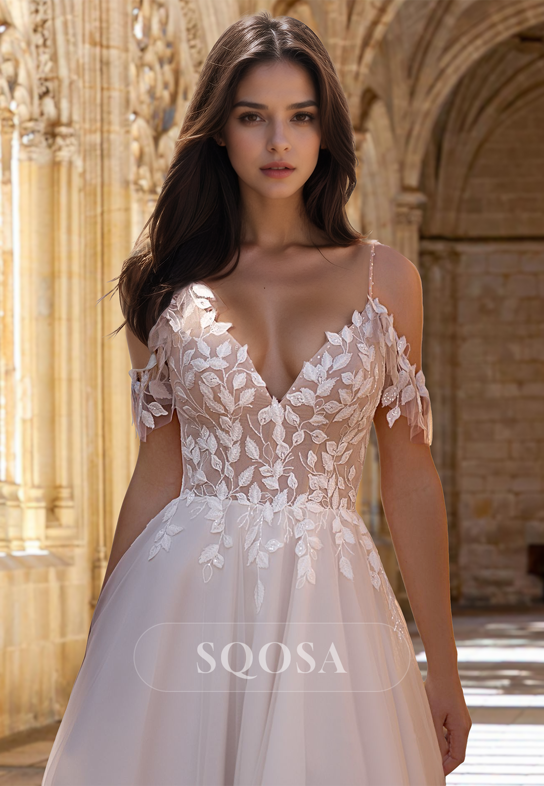 V-Neck Spaghetti Straps Sleeveless A-Line Wedding Dress Foliage Motif Applique Pleated Bride Gowns