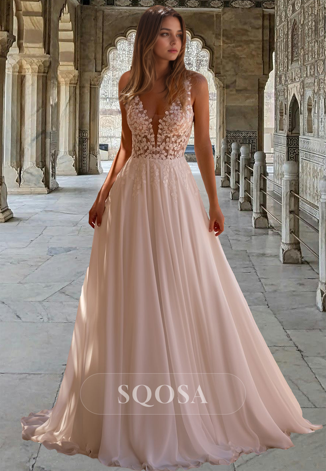 Deep V-Neck Sleeveless Pleated A-Line Wedding Dress Floral Embellished Cutout Chiffon Bride Gowns
