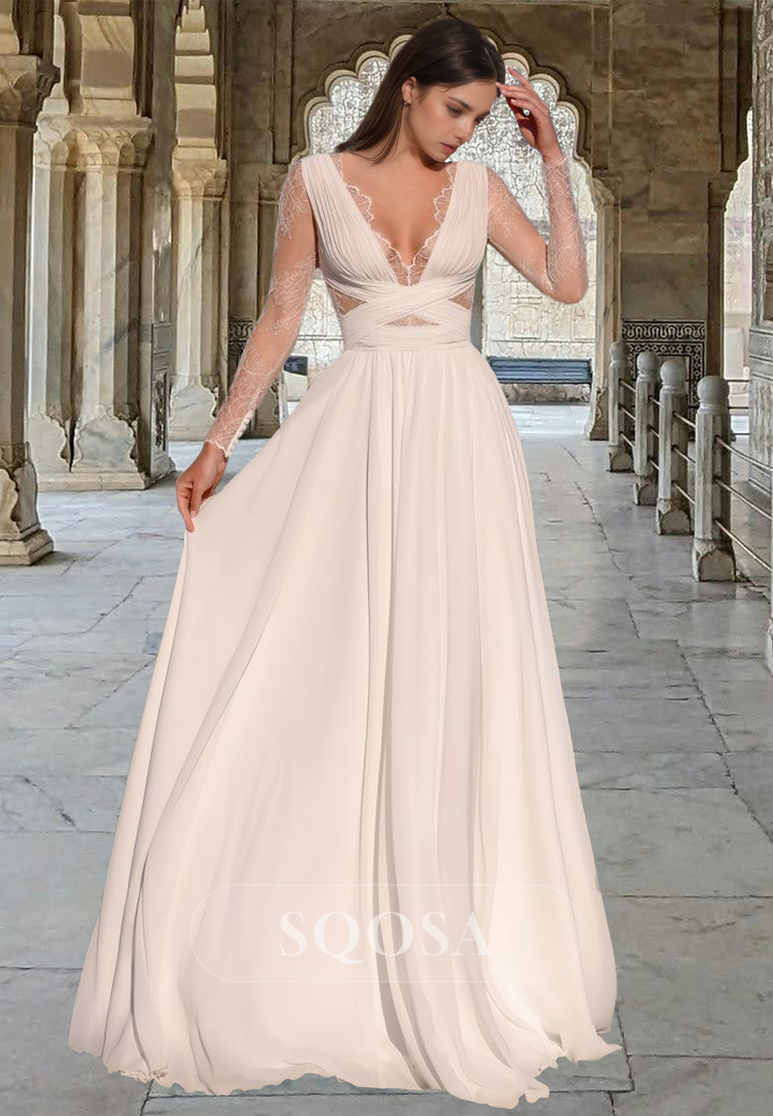 Lace Long-Sleeves Deep V-Neck Pleated Bride Gowns Pleated Cutout Chiffon A-Line Wedding Dress