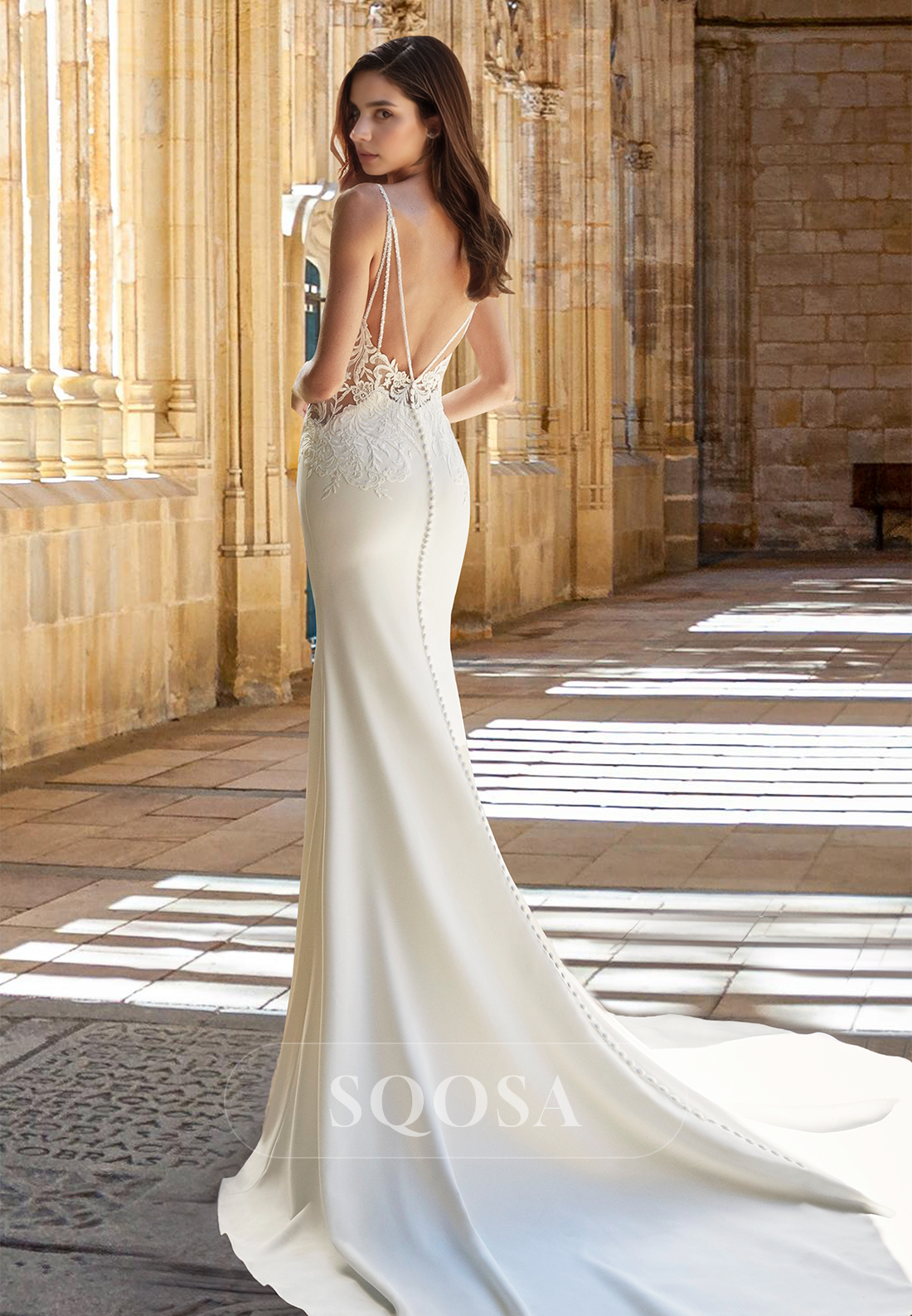 Spaghetti Straps Plunging V-Neck Sleeveless Bride Gowns Lace Applique Mermaid Prom Dress with Train