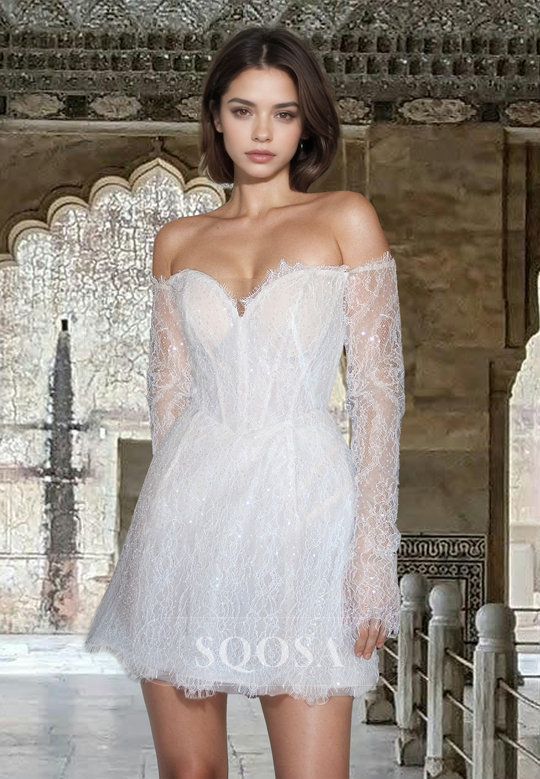 Sweetheart Off-Shoulder Long-Sleeves Beaded Allover Lace Cutout Boho Beach A-Line Short Wedding Dress x 1;