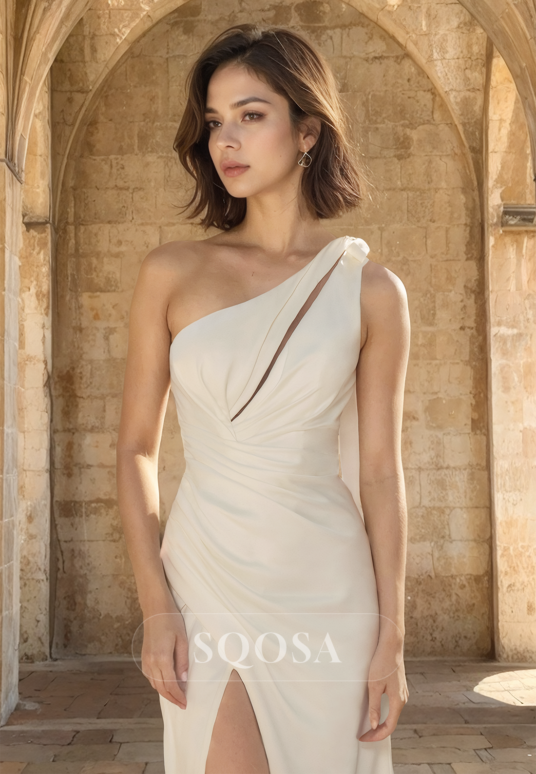 Asymmetrical-Neck Off-Shoulder Sleeveless Pleated Cutout Slit Mermaid Prom Dress with Train