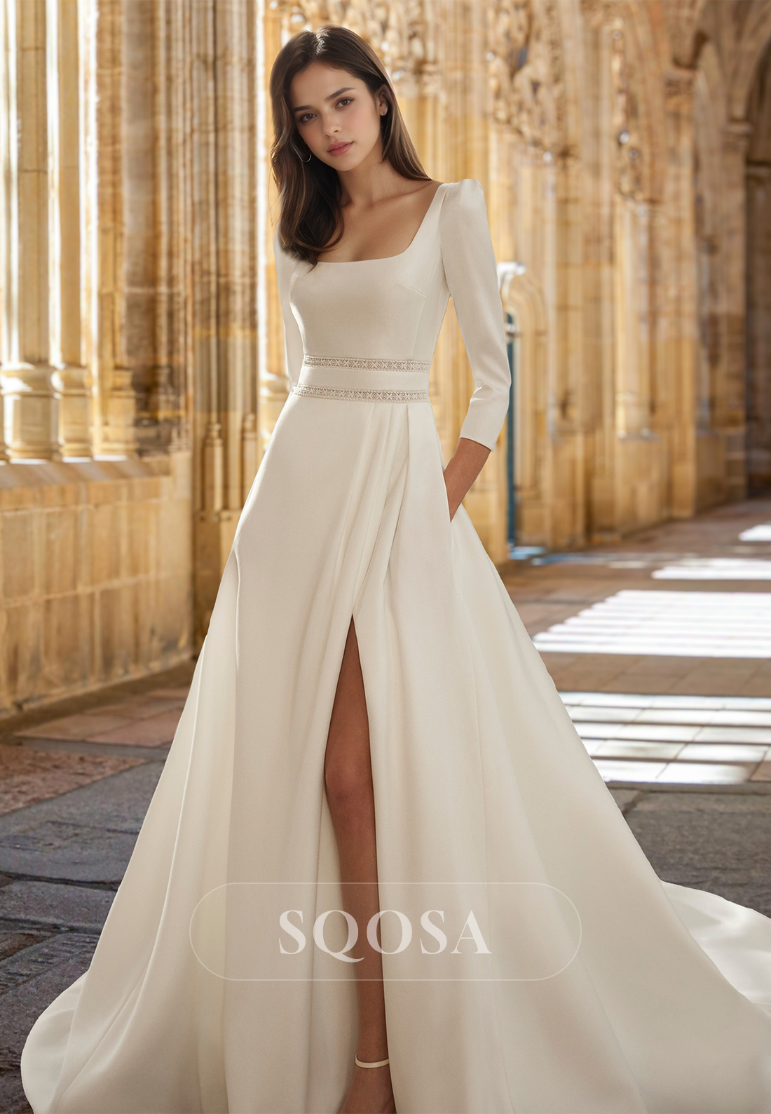 Square-Neck Long-Sleeves Beaded Pleated Train Satin A-Line Wedding Dress with High Slit