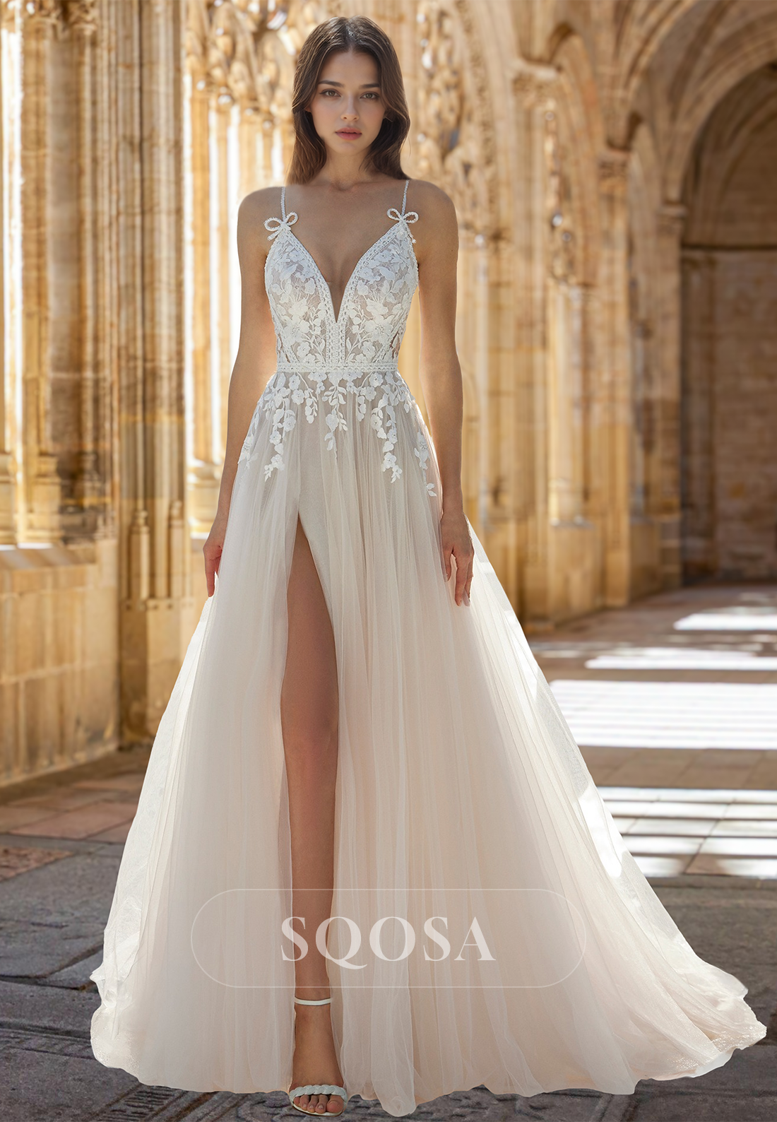 Deep V-Neck Spaghetti Straps Pleated Bride Gowns Sleeveless Applique Tulle A-Line Wedding Dress