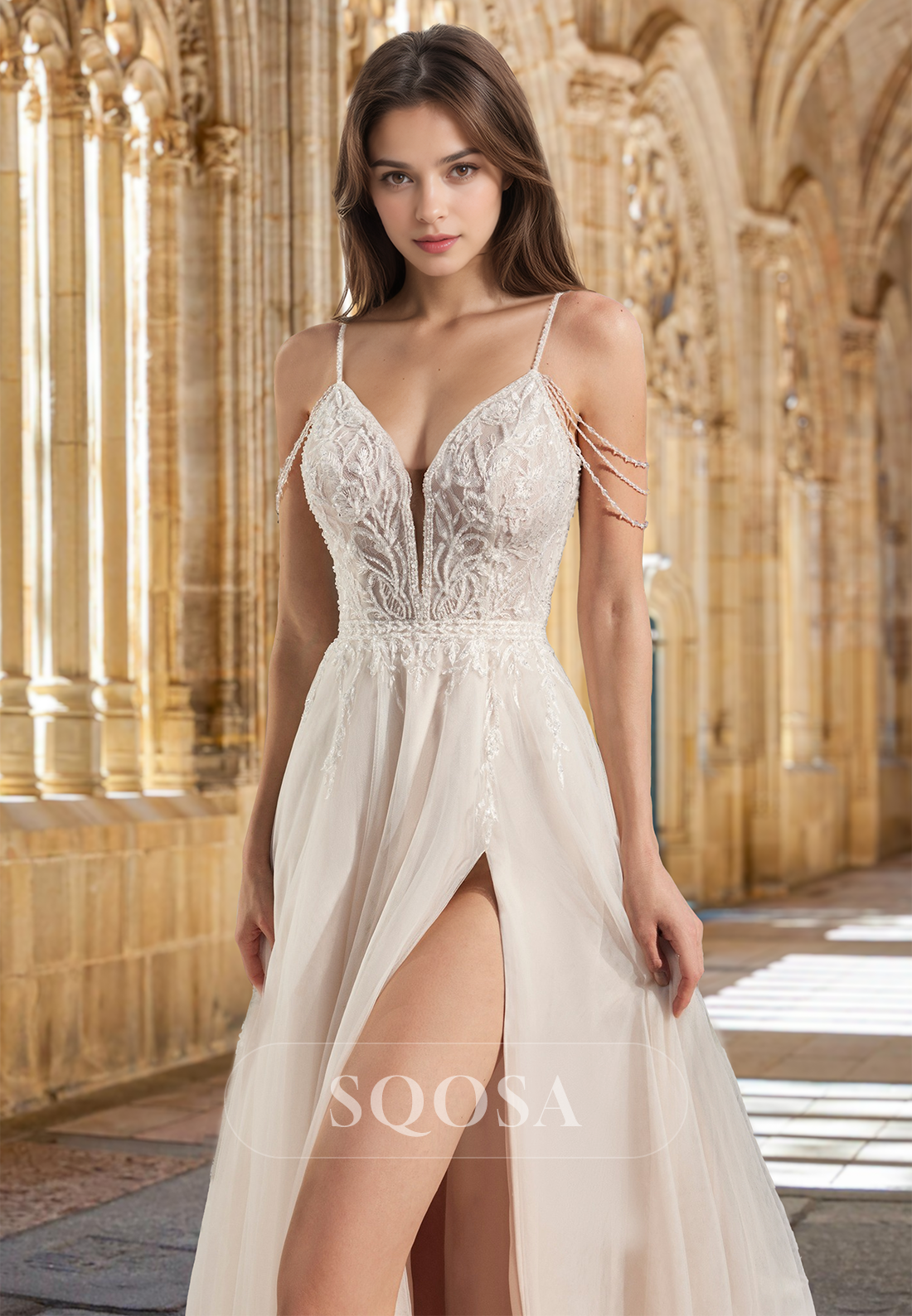 This elegant A-line wedding dress features a deep V-neck and delicate spaghetti straps, allowing for a romantic off-shoulder look. The sleeveless design is adorned with intricate beading and applique detailing, making it the perfect choice for any bride looking for a touch of glamour on her special day.