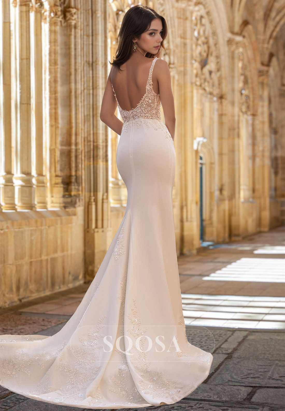 Spaghetti Straps Sleeveless Mermaid Wedding Dress Deep V-Neck Applique Beaded Pleated Bride Gowns