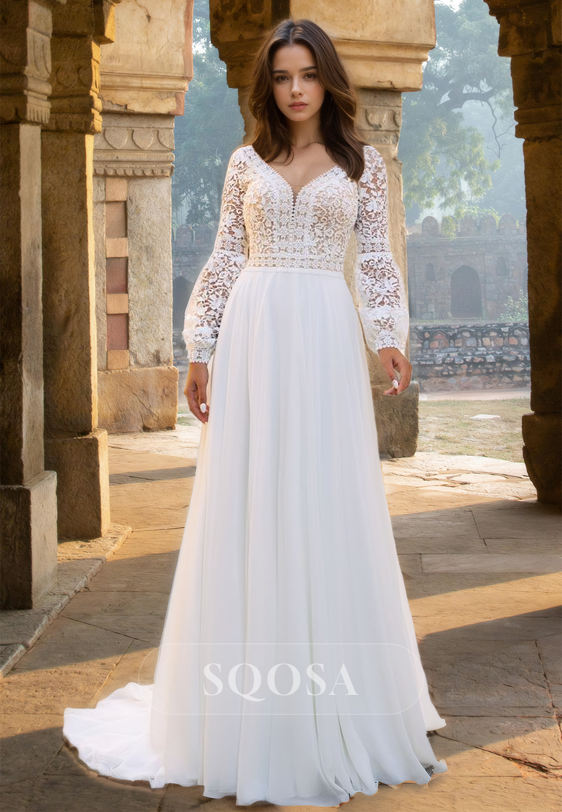 Long-Sleeves V-Neck Lace Applique Cutout Pleated Bride Gowns A-Line Cutout Chiffon Wedding Dress