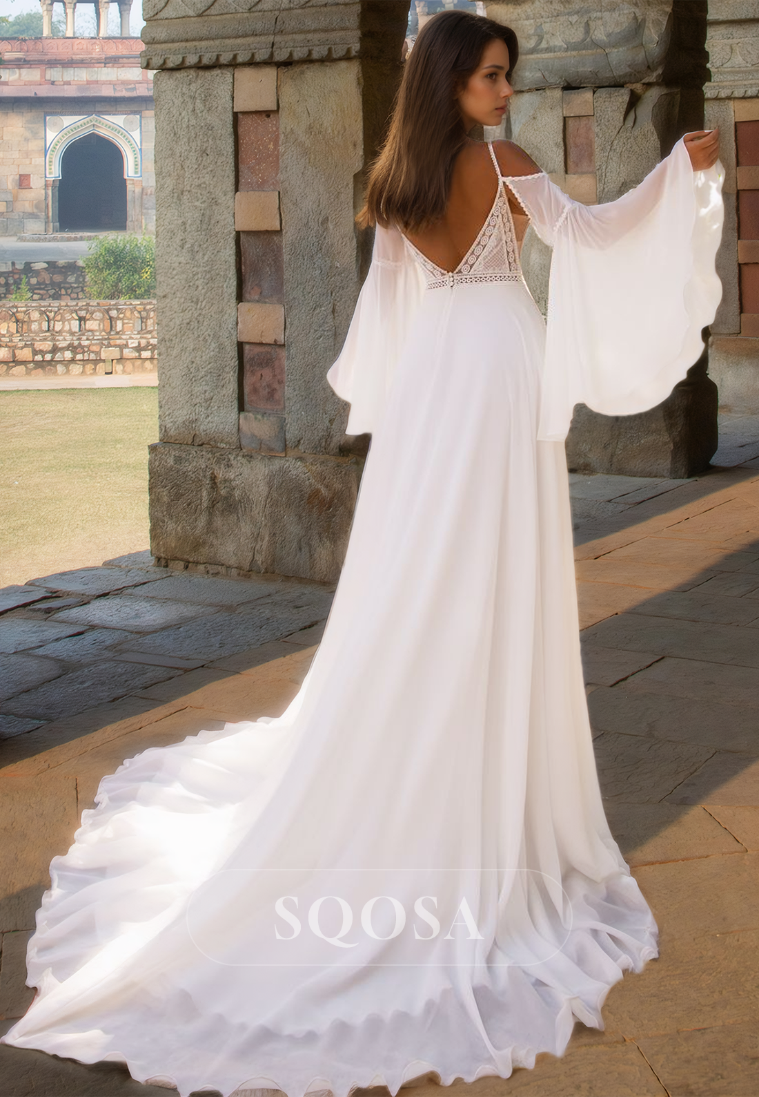 This elegant and ethereal wedding dress features spaghetti straps, long-sleeves, and a chiffon A-line silhouette. The deep V-neckline is accented with delicate pleats and lace appliques for a romantic touch. Perfect for a bride looking for a timeless and sophisticated look.
