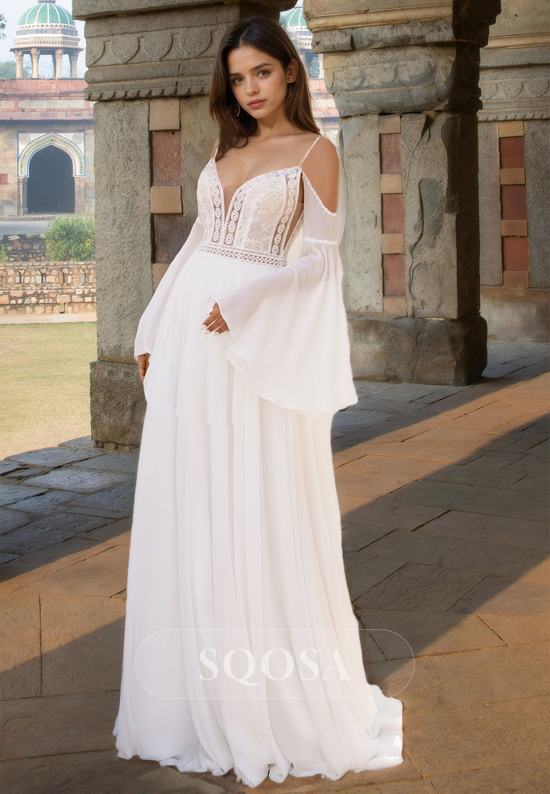 Spaghetti Straps Long-Sleeves Chiffon A-Line Wedding Dress Deep V-Neck Pleated Lace Applique Bride Gowns