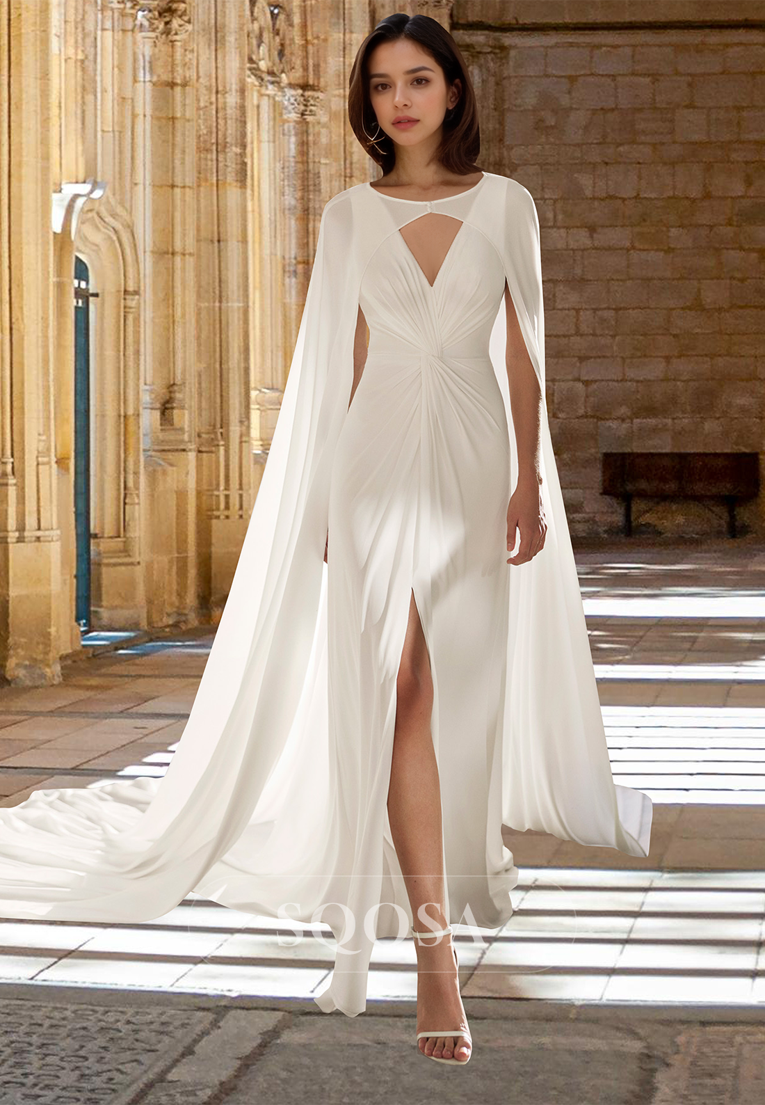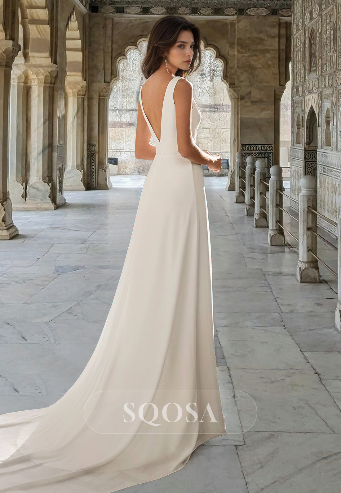 V-Neck Straps Off-Shoulder Fitted Wedding Dress Sleeveless Pleated Chiffon Bride Gowns with Overlay