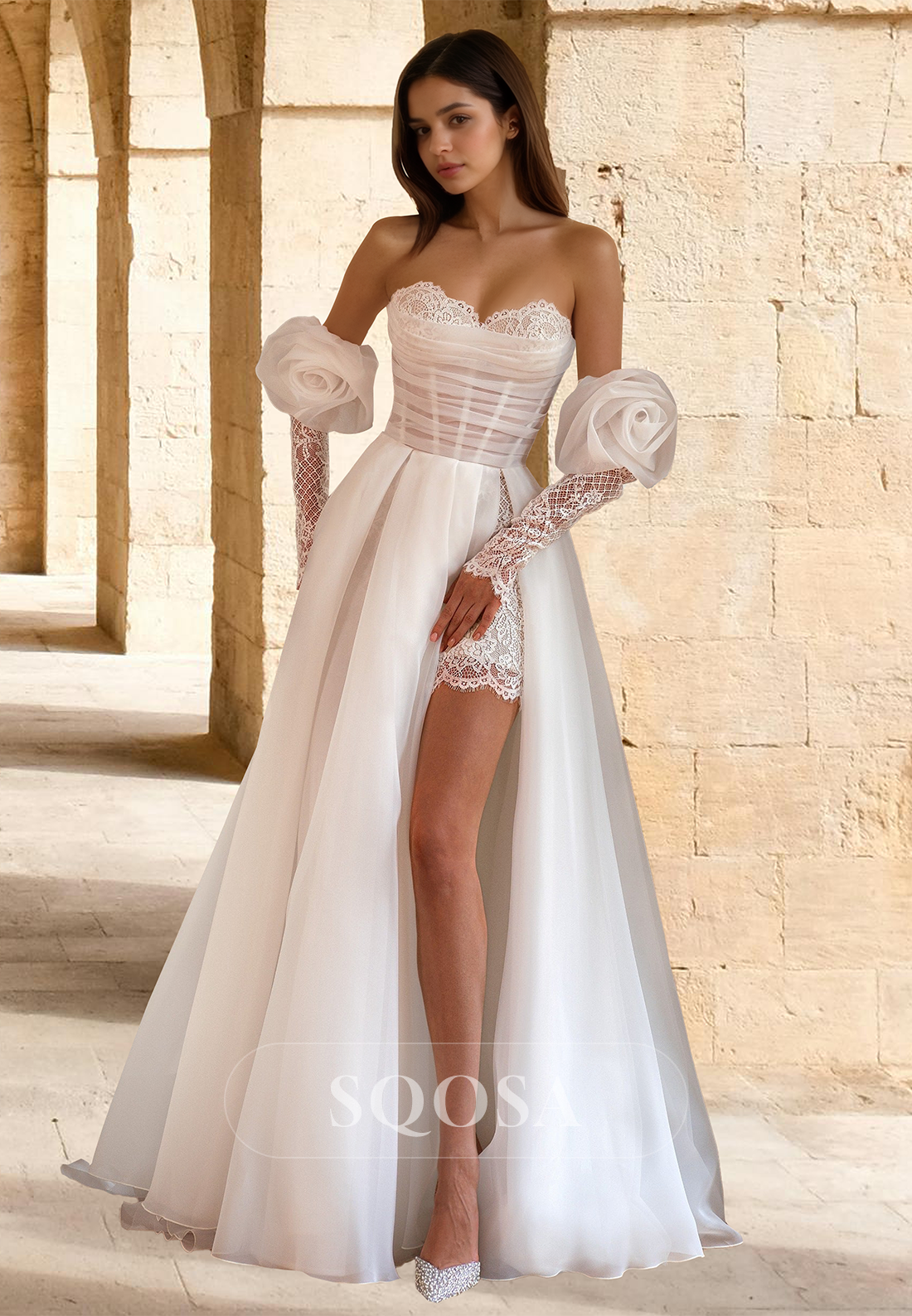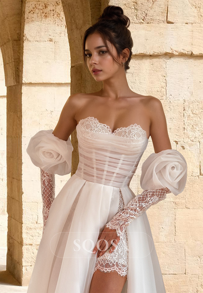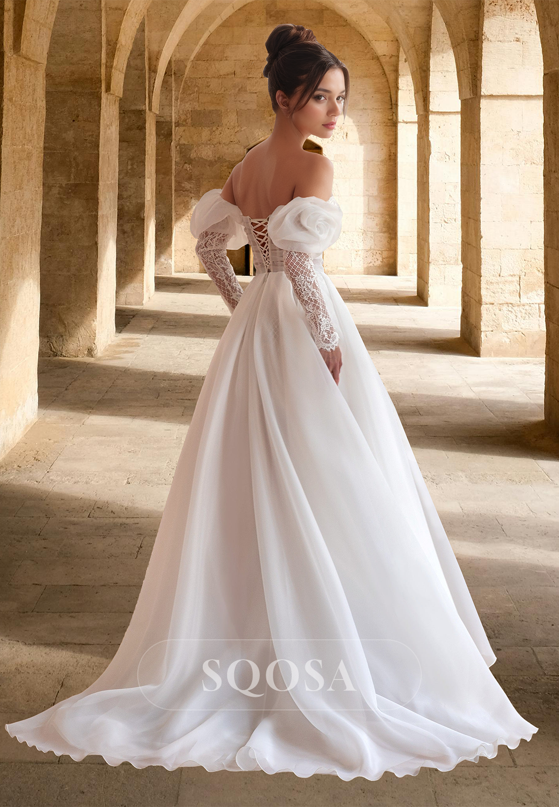 Sweetheart Lace Long-Sleeves Bride Gowns Off-Shoulder Pleated Tulle A-Line Wedding Dress with High Slit