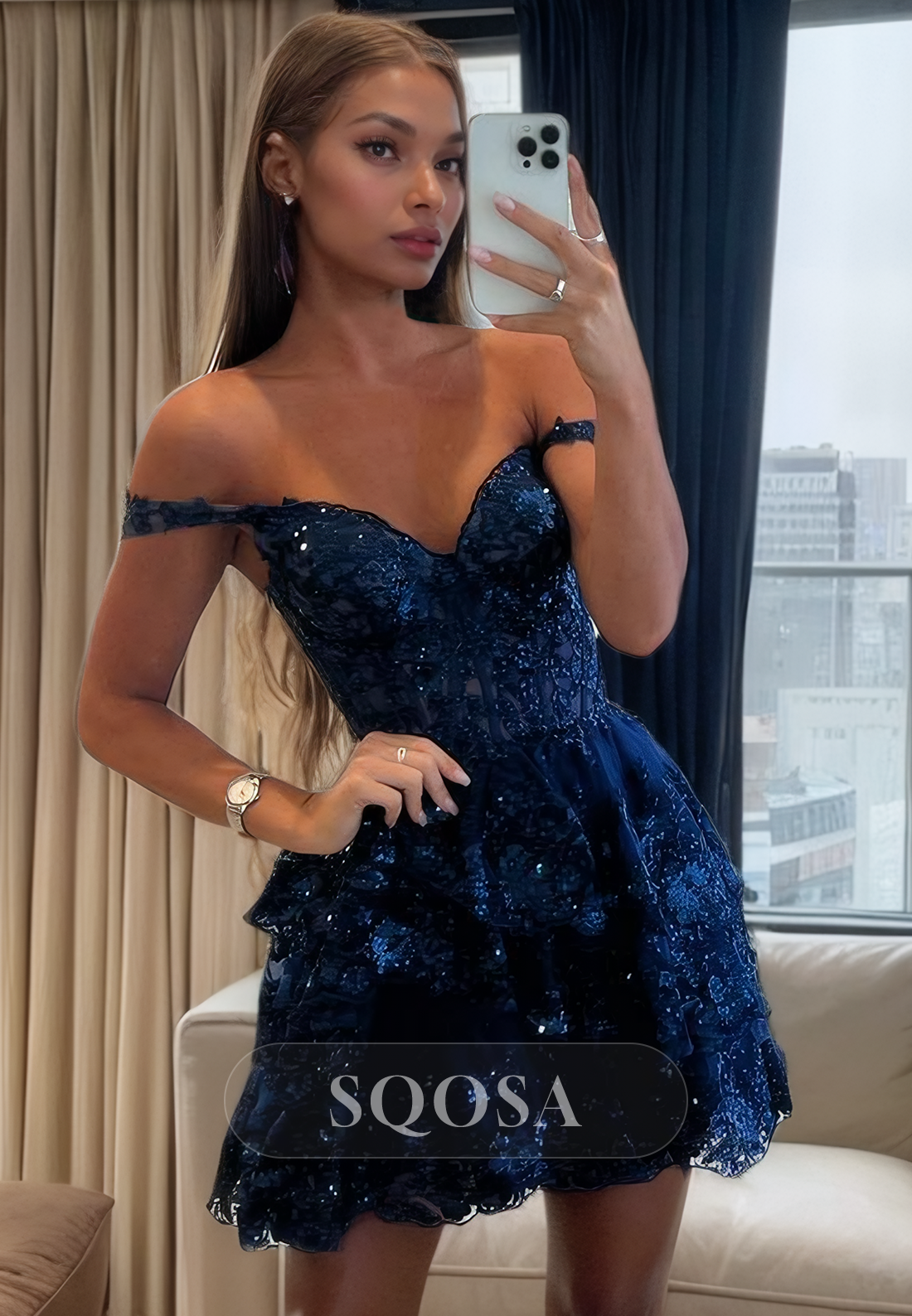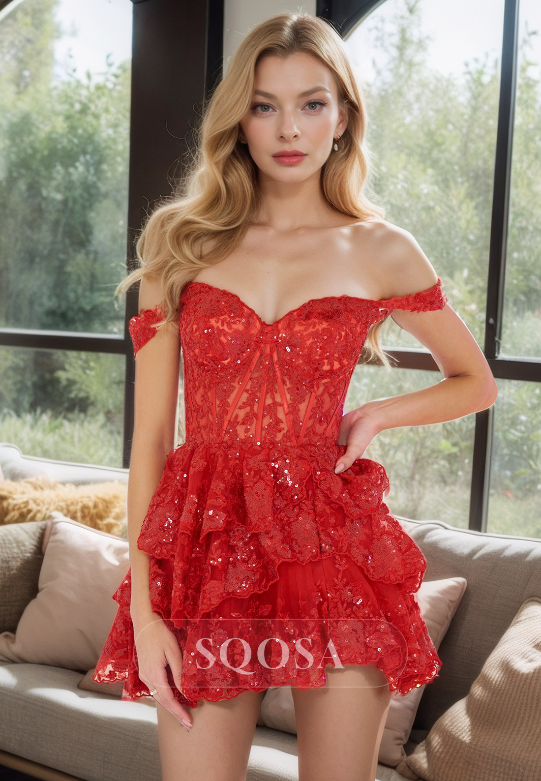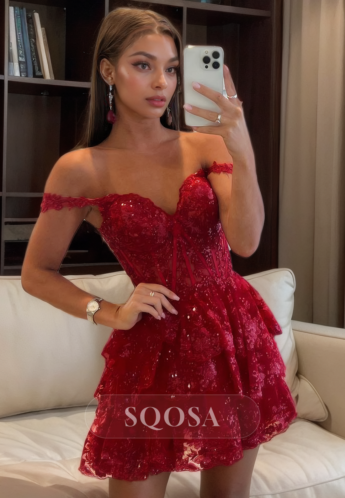 A Line Off Shoulder Lace Appliques Homecoming Dress 2024 Short Graduation Dress x 1;