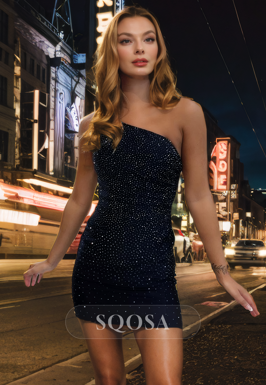 Sheath One Shoulder Beads Short Homecoming Dress Tight Graduation Dress