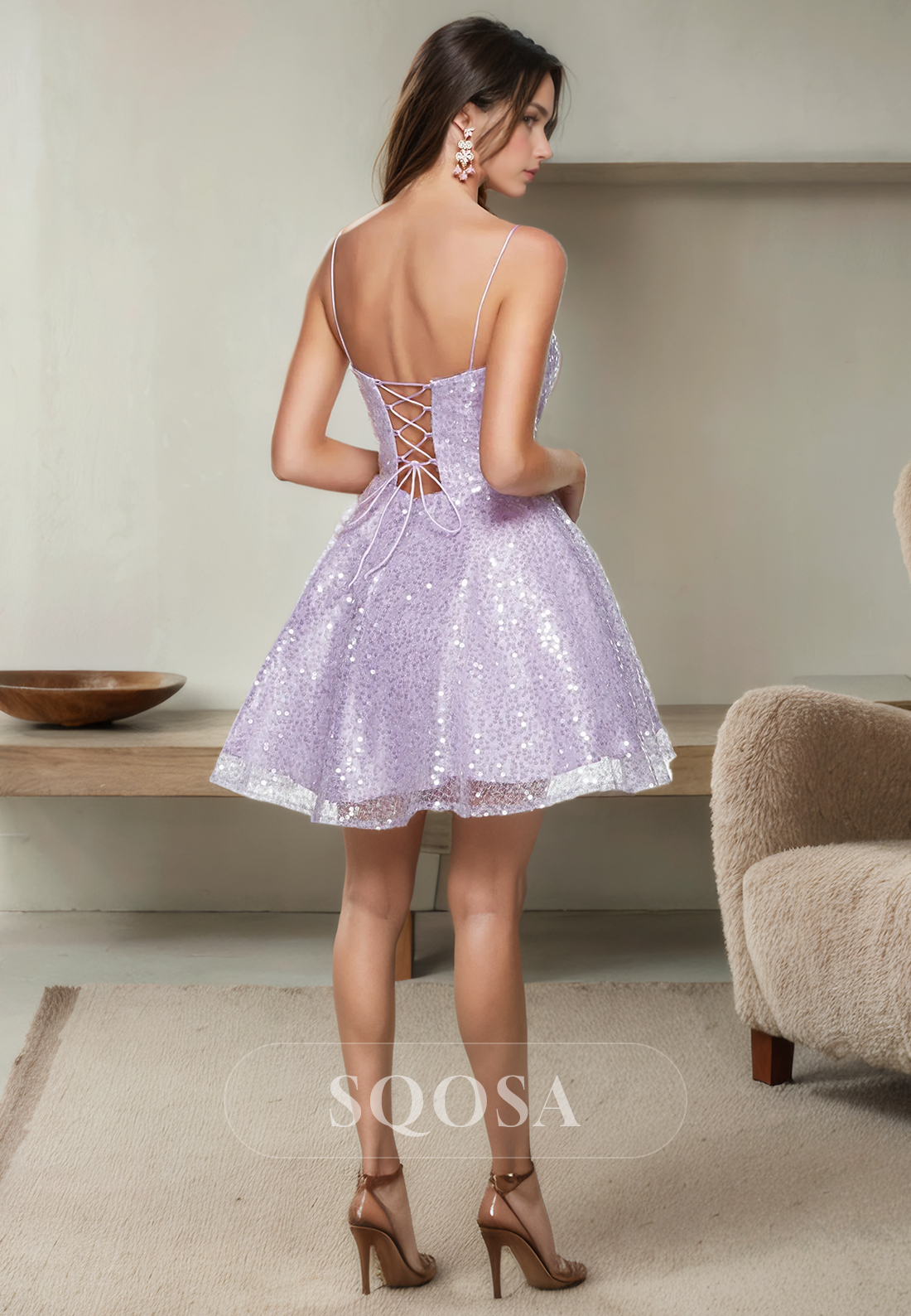 This A Line Spaghetti Straps Lilac Homecoming Dress Short Graduation Dress features a flattering A-line silhouette and delicate spaghetti straps. Perfect for homecoming or graduation ceremonies, this dress offers a timeless and elegant look. Made with high-quality materials, it ensures comfort and style for any special occasion.