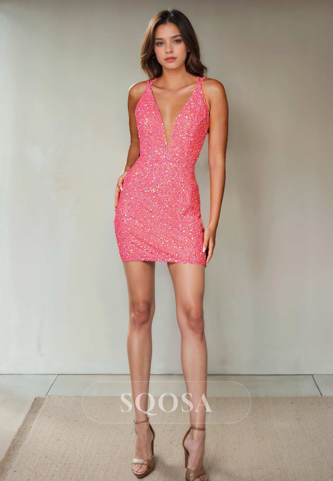 Plunging V Neck Sequins Short Homecoming Dress Tight Graduation Dress