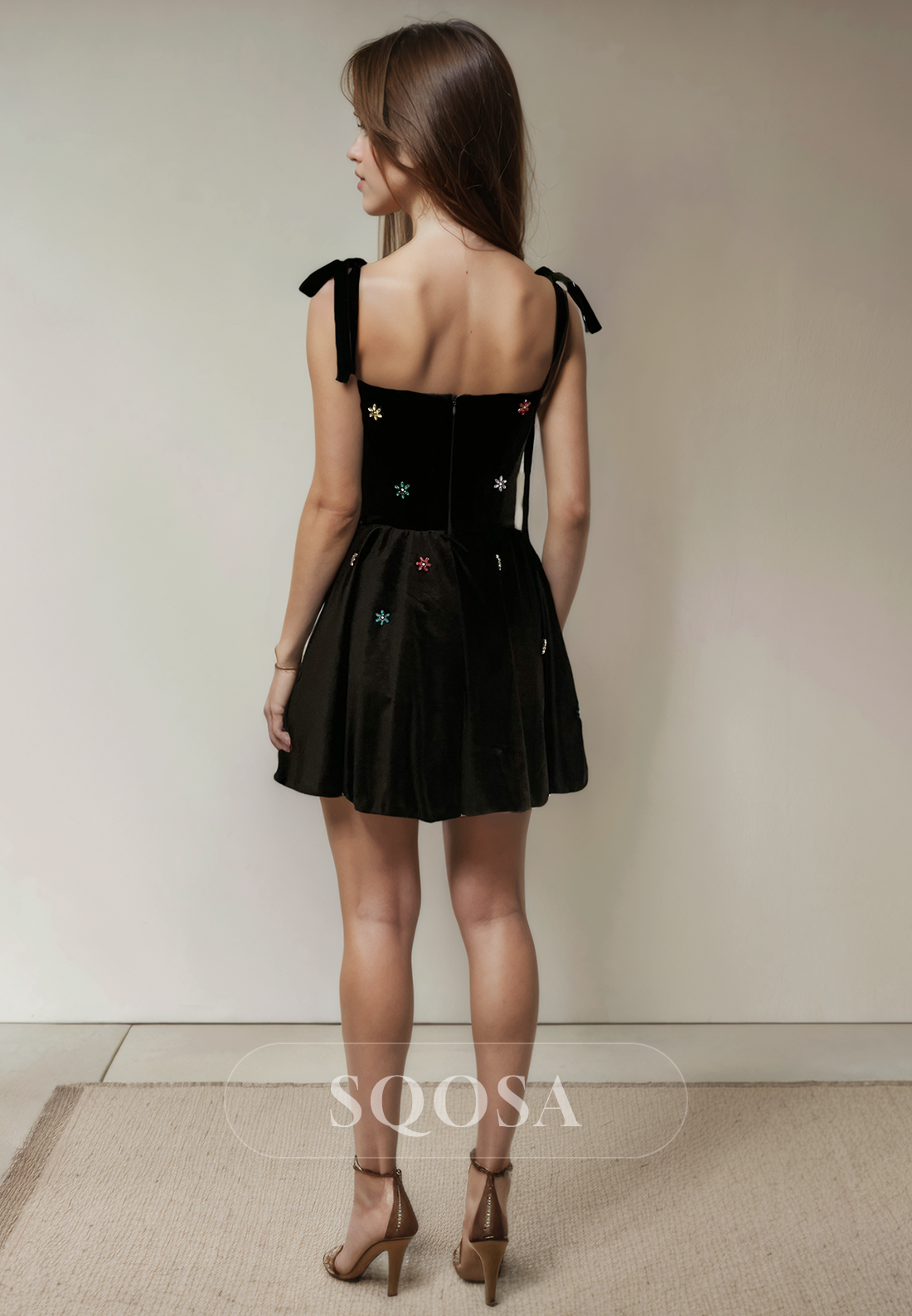 A Line Square Neckline Beads Black Homecoming Dress with Pockets Short Graduation Dress