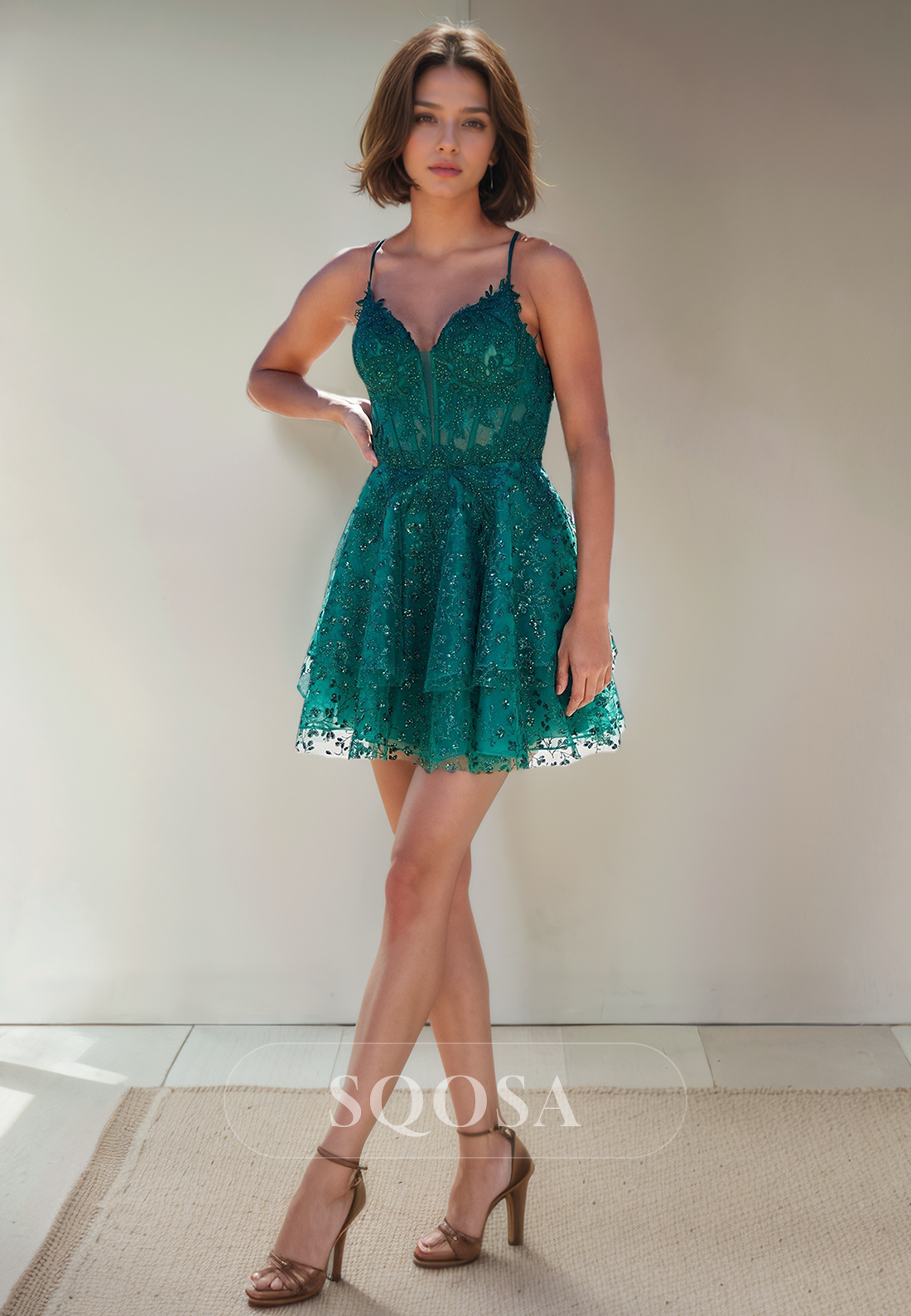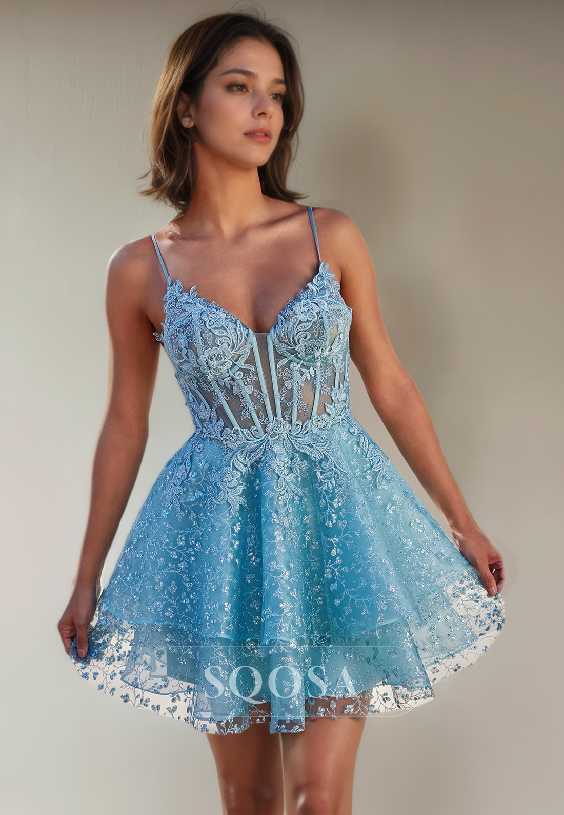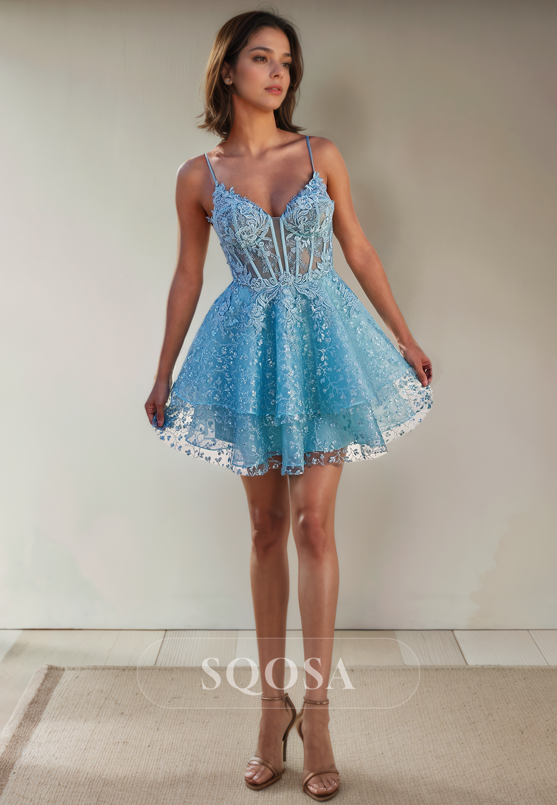 A Line Spaghetti Straps Lace Homecoming Dress Short Prom Graduation Dress