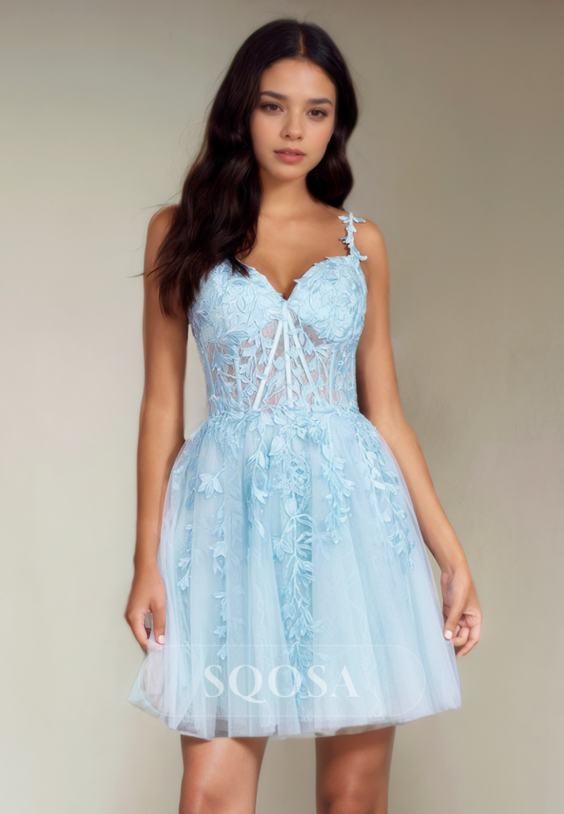 Discover the perfect blend of style and elegance with our A Line Sweetheart Lace Appliques Short Homecoming Dress. Featuring delicate lace appliques and a flattering sweetheart neckline, this dress is perfect for any special occasion. Look cute and stylish while feeling confident and comfortable in this must-have graduation dress.