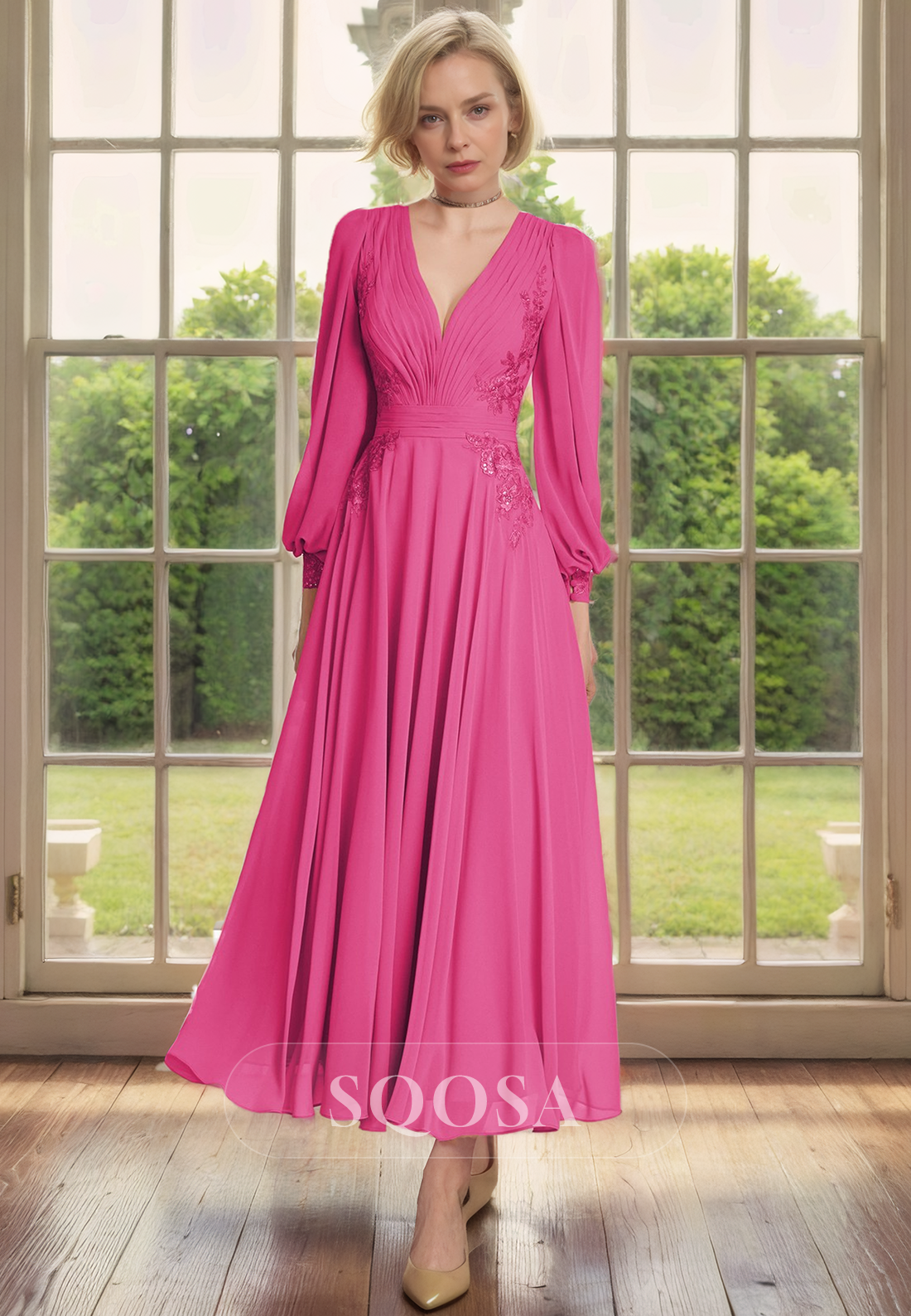 This elegant mother of the bride dress features a flattering A-line silhouette, a V-neckline, and chiffon appliques for added texture. The long sleeves offer coverage and a touch of modesty, making it perfect for formal occasions. With its timeless design and high-quality construction, this dress is a sophisticated and stylish choice for any mother of the bride.