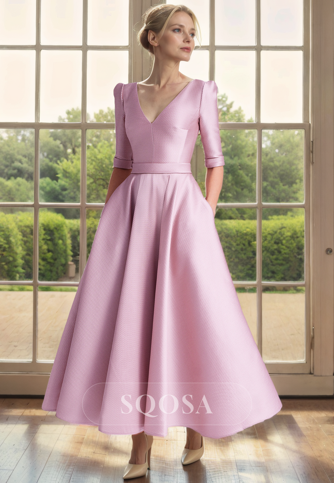 A Line V Neck 3/4 Sleeves Elegant Mother of the Bride Dress with Pockets Pink Cocktail Dress x 1;