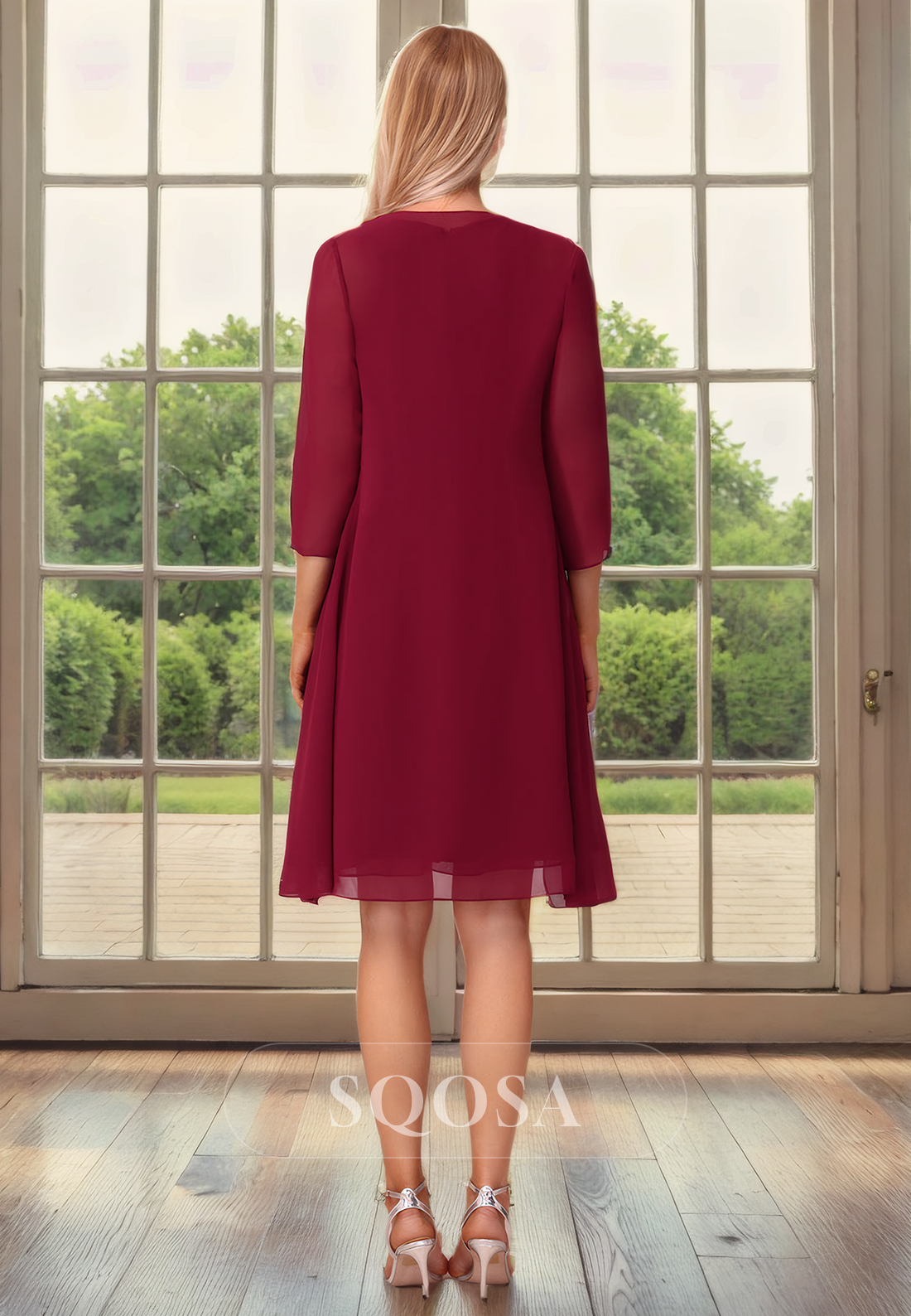 A Line Bateau Chiffon Pleats Burgundy Mother of the Bride Dress with Jacket for Wedding