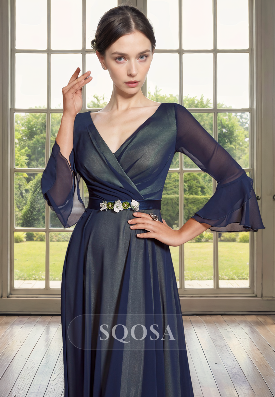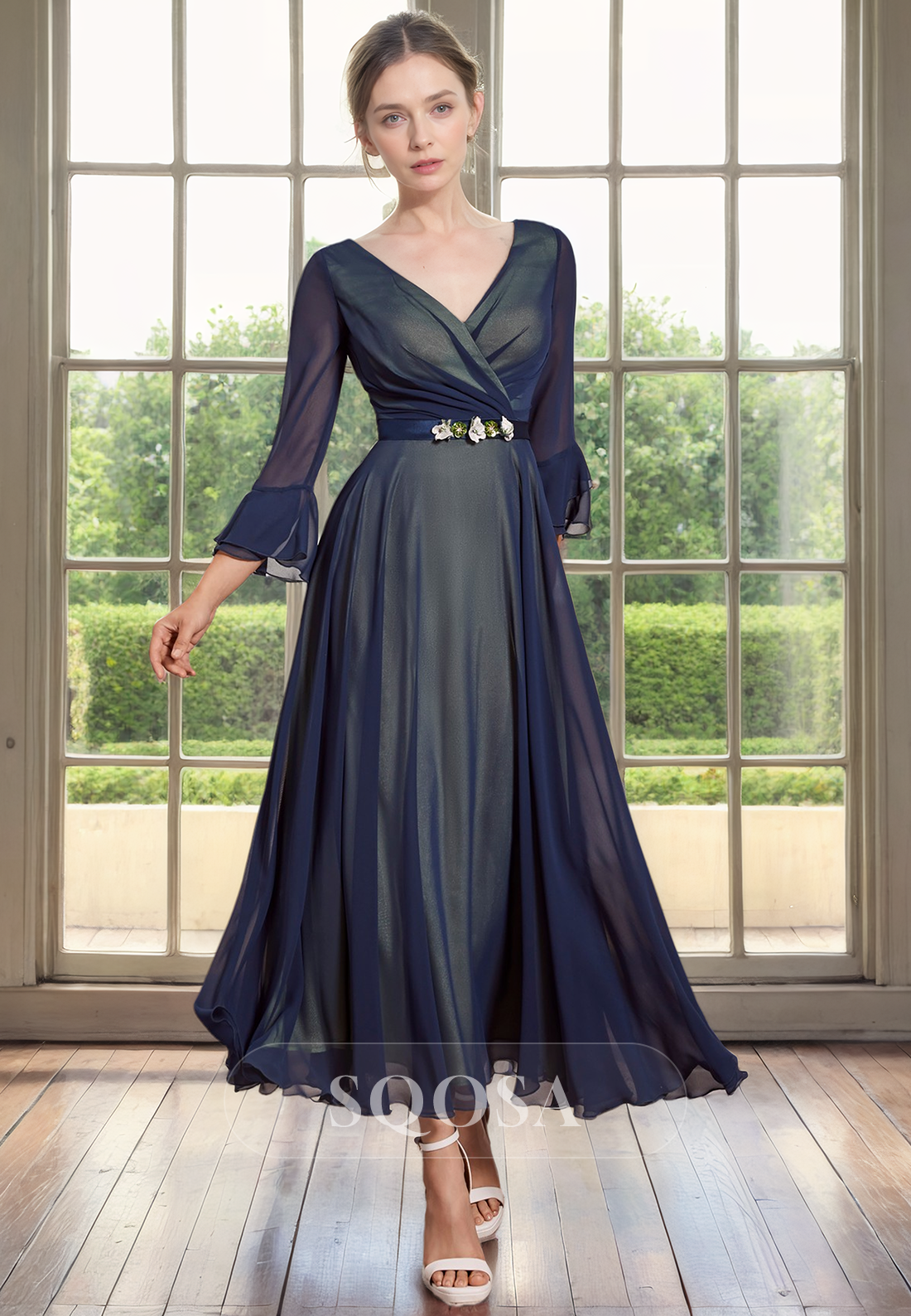 Expertly crafted with a V neck and 3/4 sleeves, this elegant A line dress is perfect for any mother of the bride. The flattering design will make you feel confident and stylish on your daughter's special day. Made with high quality materials, this dress is the perfect choice for a wedding.