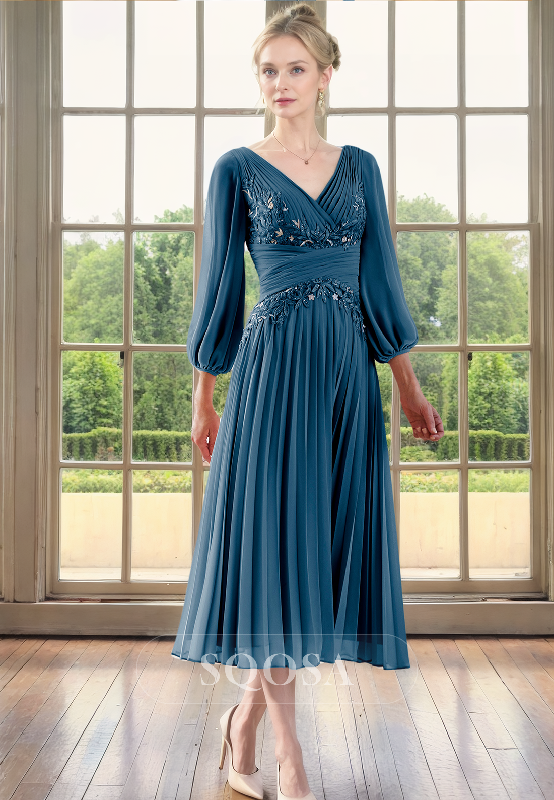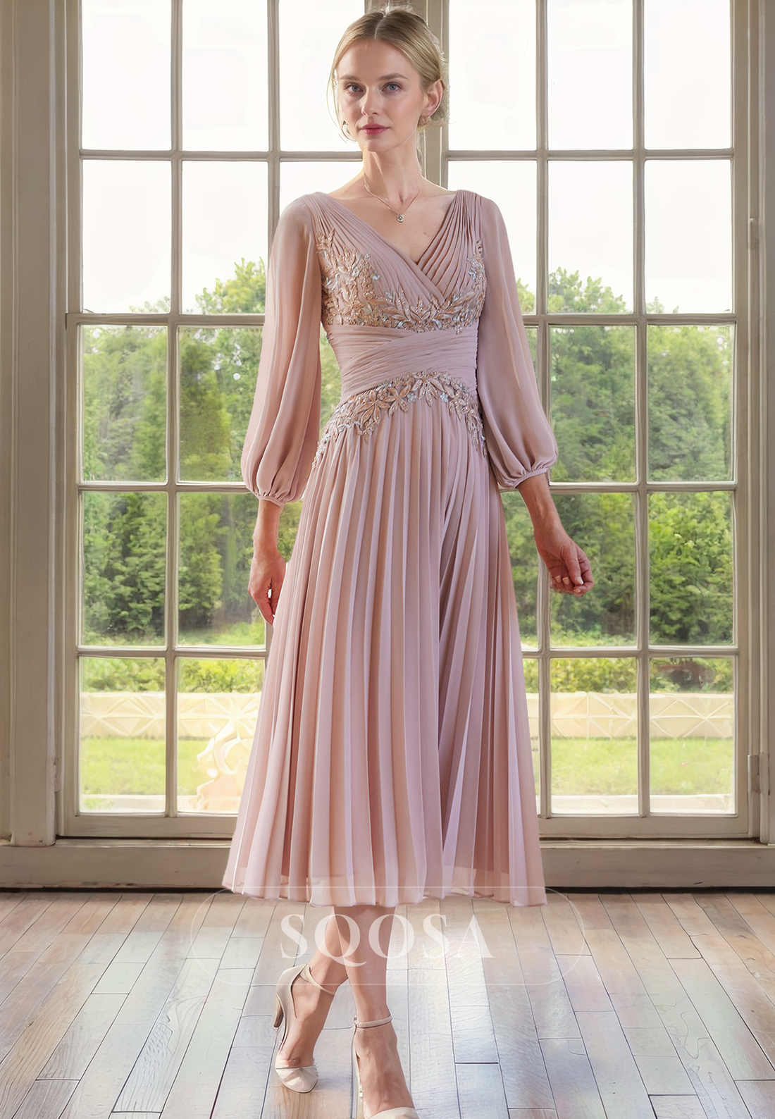 Elevate your mother of the bride look with our A Line V neck Chiffon Pleats 3/4 Sleeves Dress. The delicate chiffon fabric and pleated design accentuate your figure, while the V neck adds a touch of elegance. Perfect for weddings and cocktail parties, this dress will make you stand out.