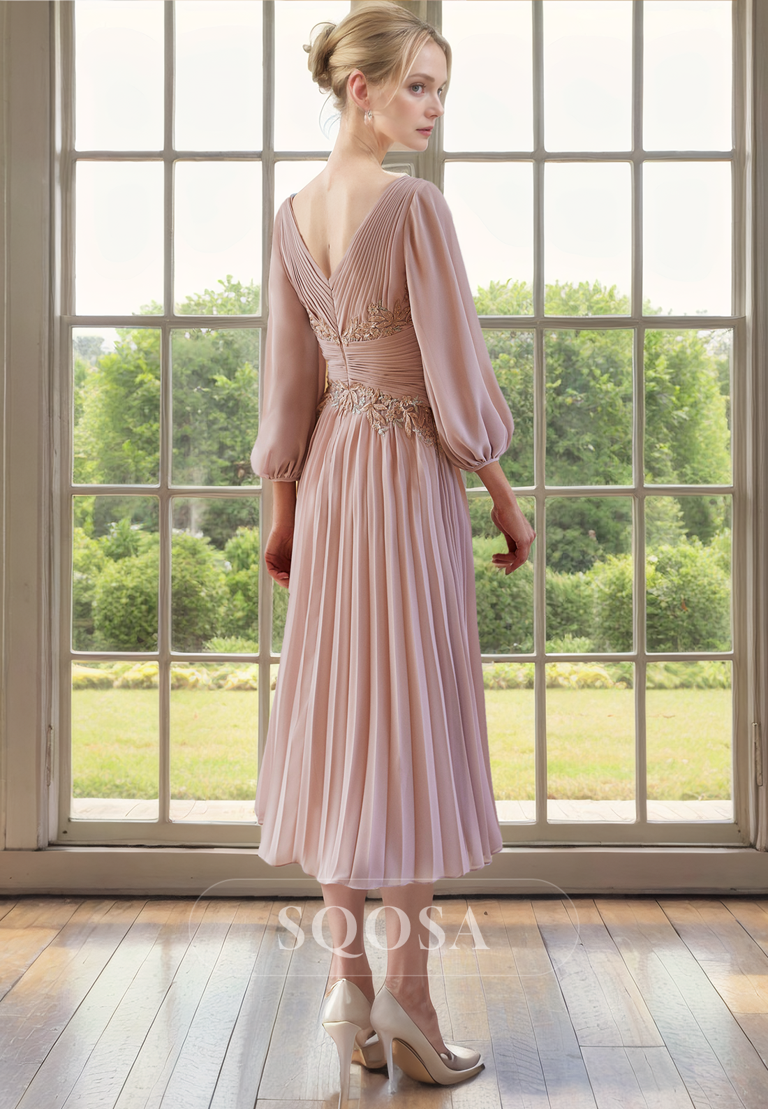 A Line V neck Chiffon Pleats 3/4 Sleeves Mother of the Bride Dress for Wedding Cocktail Dress