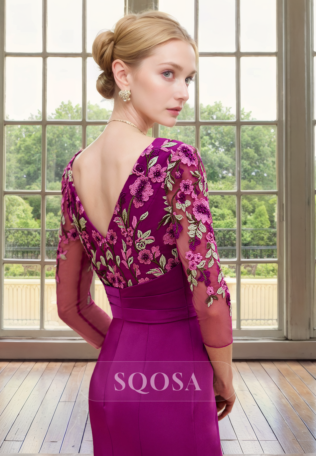 Sheath V Neck 3/4 Sleeves Appliques Elegant Mother of the Bride Dress for Wedding