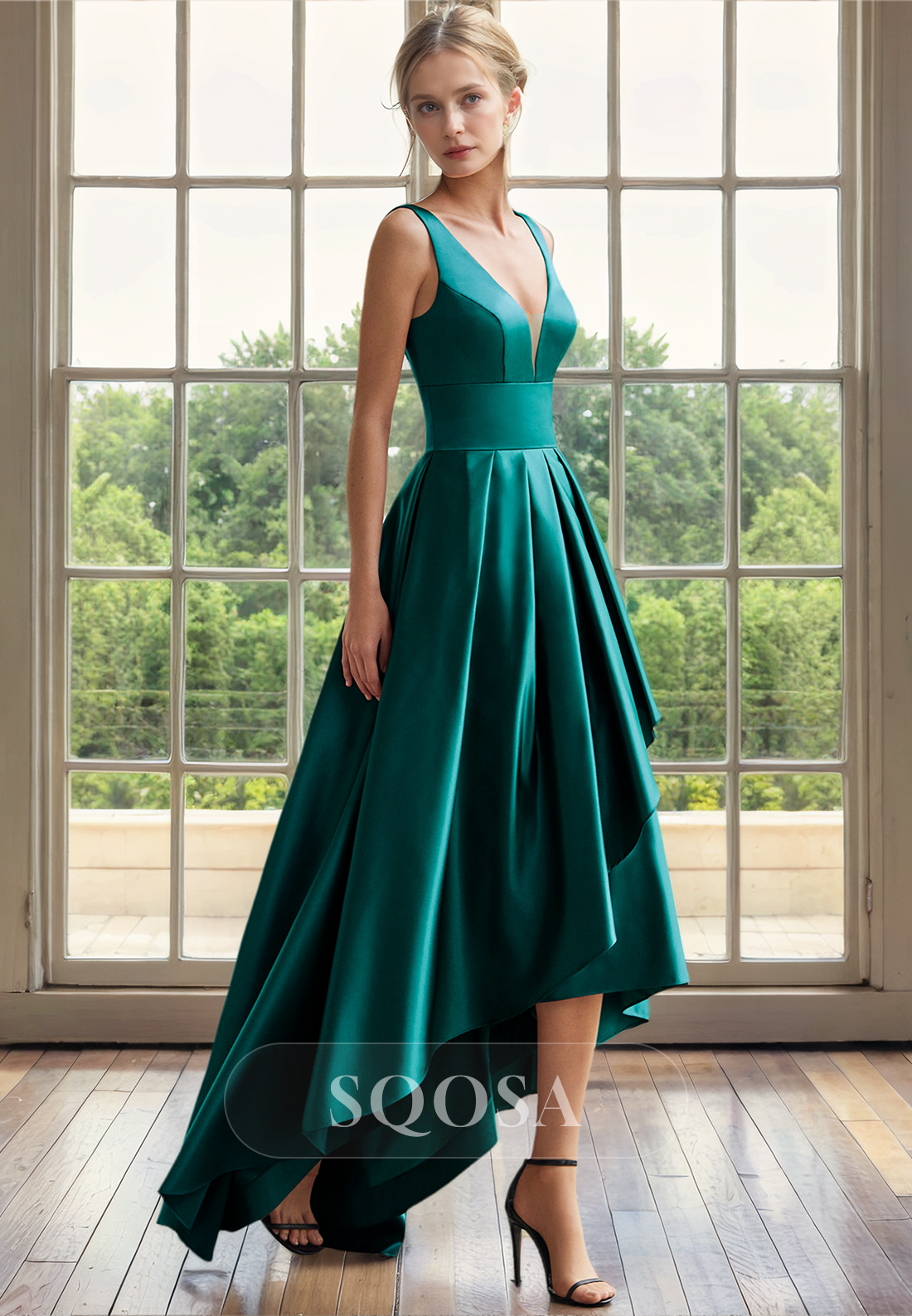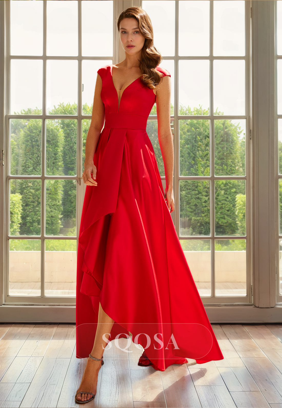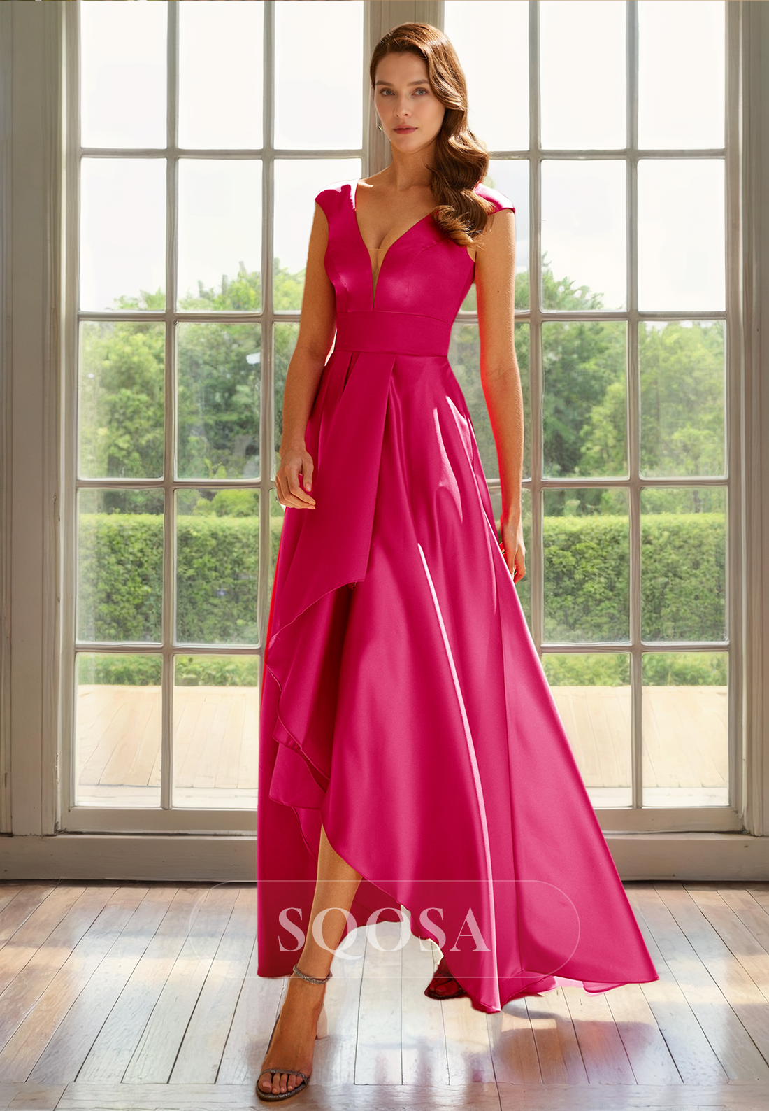 Sexy V Neck Satin Simple Cocktail Dress High Low Mother of the Bride Dress for Wedding