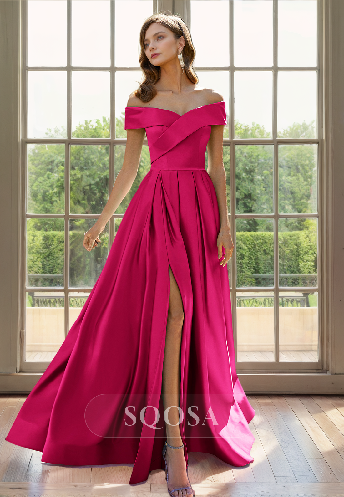 A Line Off Shoulder Satin Elegant Long Cocktail Dress with Slit Mother of the Bride Dress
