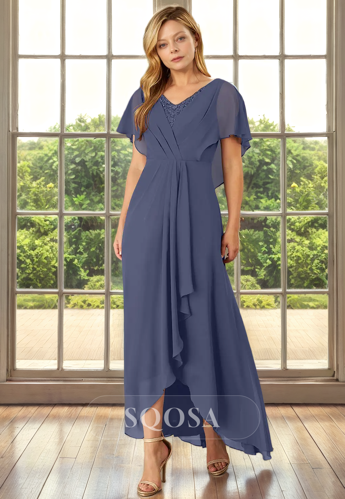 This elegant mother of the bride dress features a flattering A-line silhouette with a V-neck and short sleeves. Made of high-quality chiffon fabric, it is embellished with delicate beads for a touch of sparkle. Perfect for weddings and other special occasions, this dress offers both style and comfort.