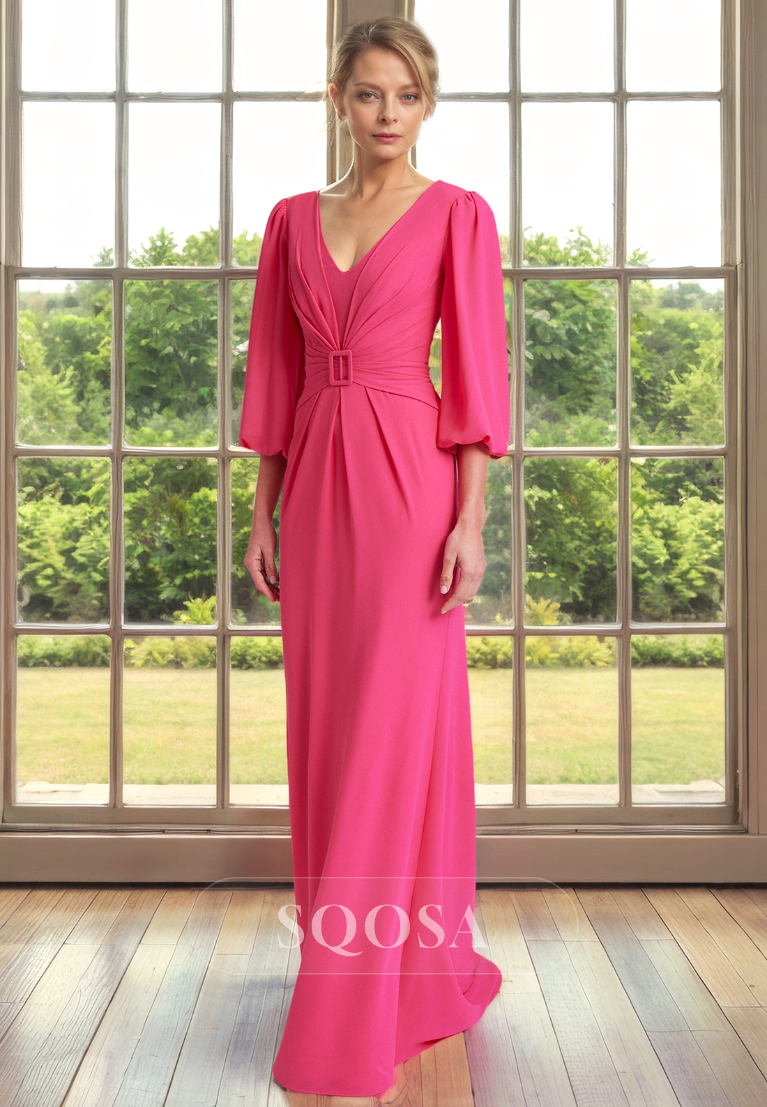 Sheath V Neck Pleats 3/4 Sleeves Mother of the Bride Dress for Wedding Long Cocktail Dress
