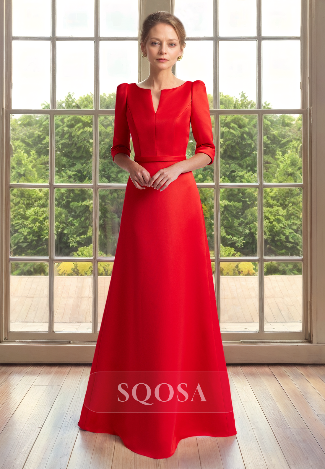 A Line V Neck Satin 3/4 Sleeves Mother of the Bride Dress Elegant Cocktail Dress